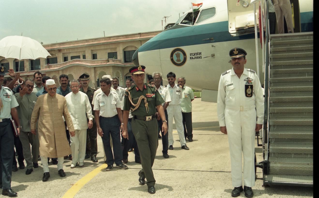 | Caption: | The President of India, Dr. Shankar Dayal Sharma being seen off by the Governor, Madhya Pradesh, Mohammad Shafi Qureshi, at Indore airport on June 29, 1997. |