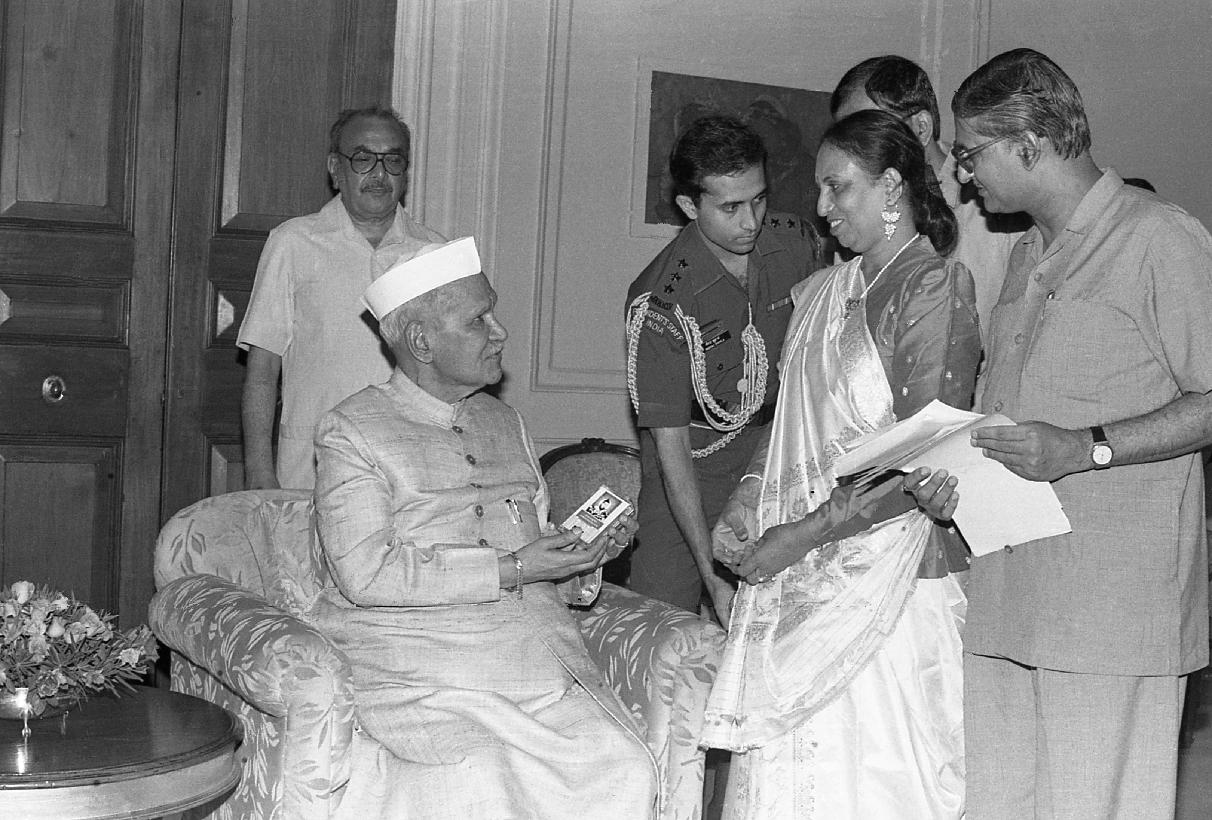 | Caption: | The President of India, Dr. Shankar Dayal Sharma receiving a set of audio cassettes "Shrimad Bhagwatgita" brought out by Shri Krishna Yoga Sansthan, Varanasi at Rashtrapati Bhavan in New Delhi on June 30, 1997. |