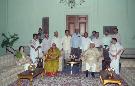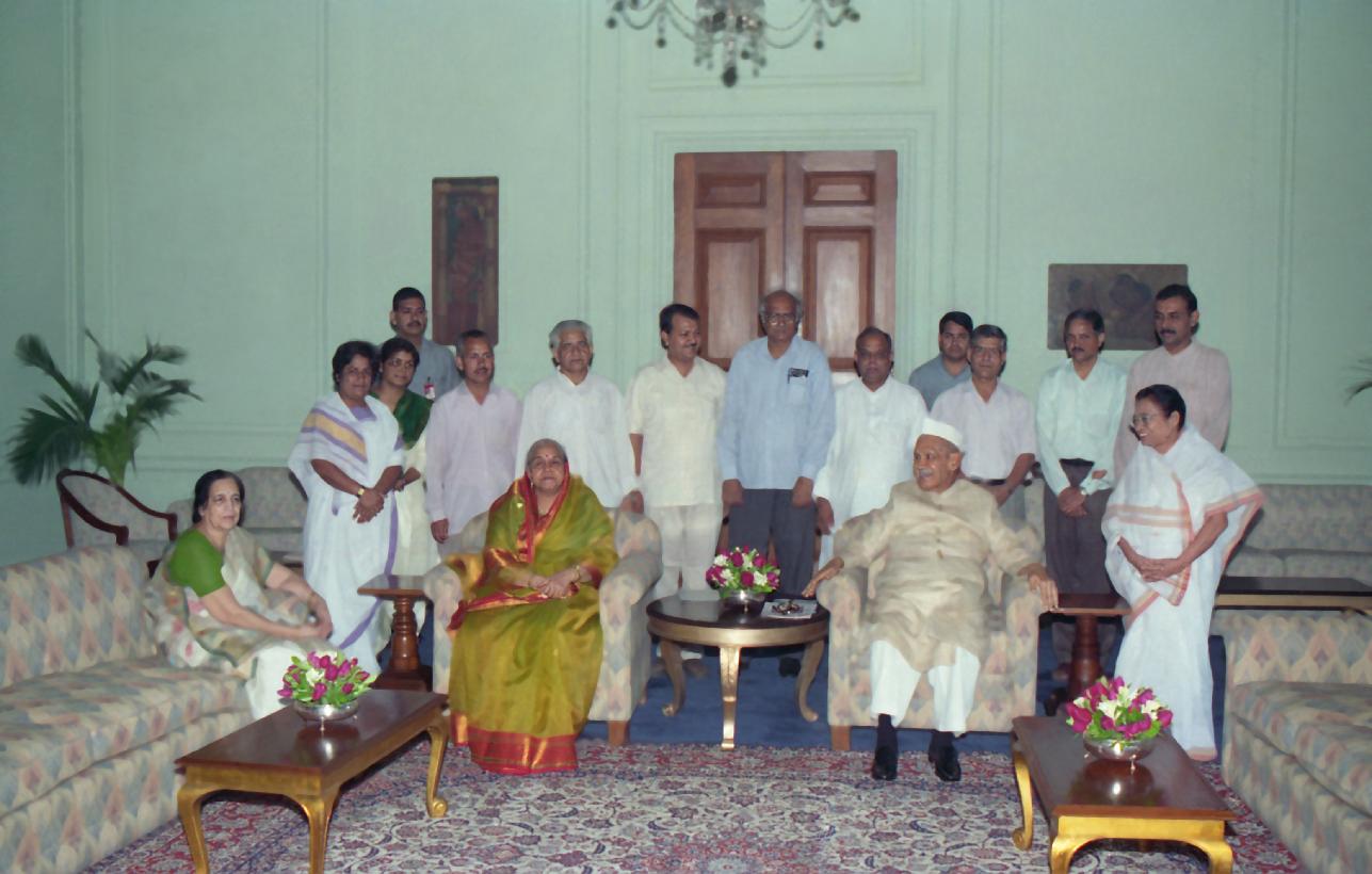 | Caption: | The President of India, Dr. Shankar Dayal Sharma receiving a copy of the book "Nityanutan" from Km. Nirmala Deshpande with others at Rashtrapati Bhavan in New Delhi on September 21, 1994. |
