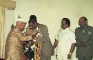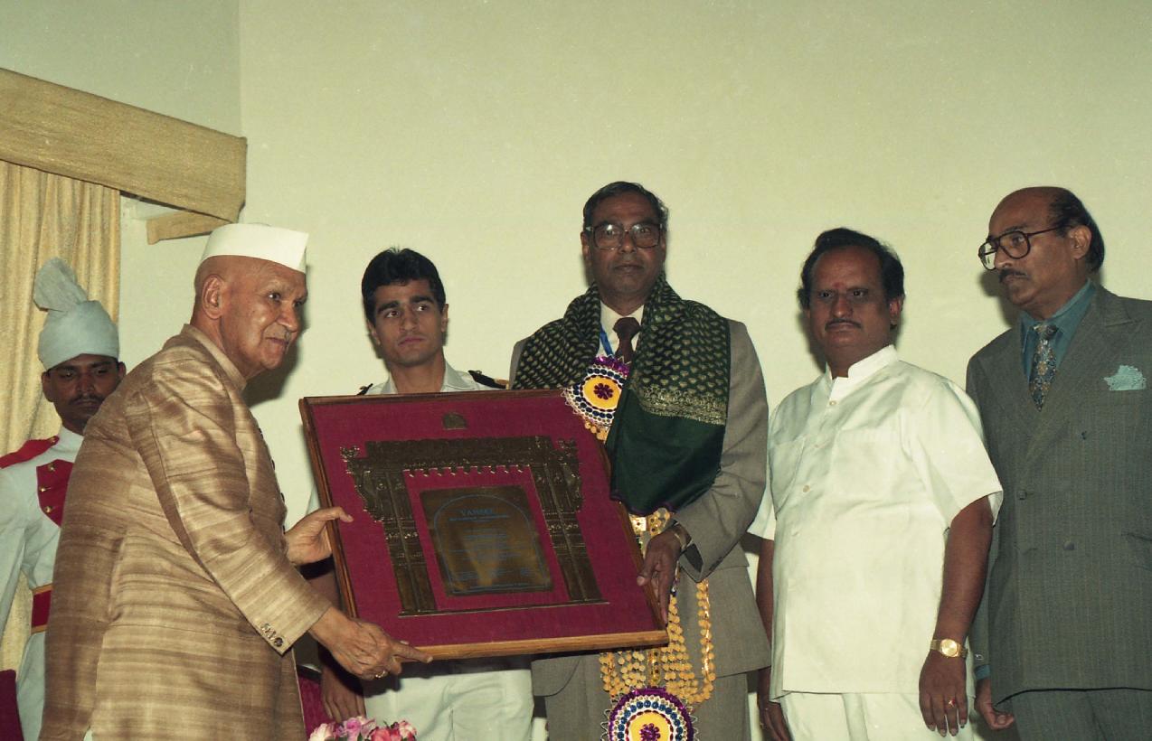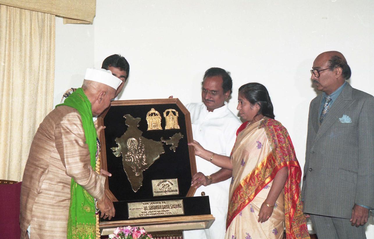 | Caption: | The President of India, Dr. Shankar Dayal Sharma presenting Dr. K.L. Rao Vamsee Gold Medal to Shri B.N. Reddy, MP(LS), at Rashtrapati Nilayam, in Secunderabad, Andhra Pradesh on November 05, 1996. |
