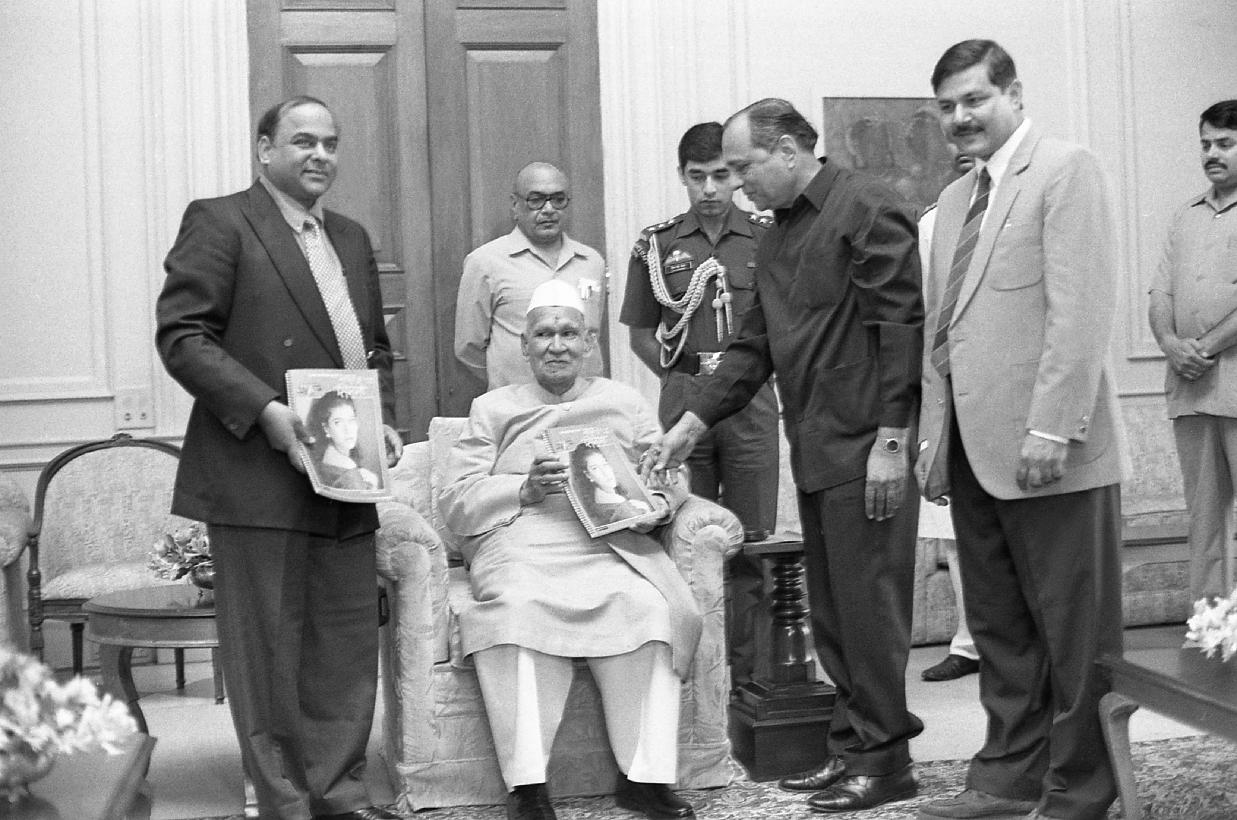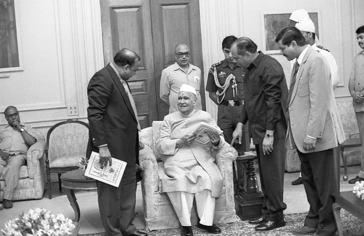| Caption: | The President of India, Dr. Shankar Dayal Sharma receiving a copy of the book "Bharat Main Cinema 1896-1996" from Shri Abhai Chhajlani with others from Nai Dunia, Bhopal, at Rashtrapati Bhavan, in New Delhi on November 08, 1996. |