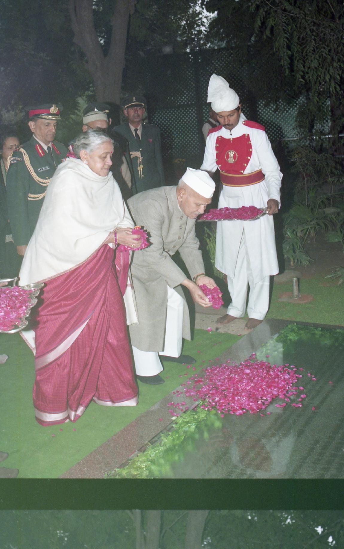 | Caption: | The President of India, Dr. Shankar Dayal Sharma paying floral tributes to late Smt. Indira Gandhi on her birth anniversary, at 1, Safdarjung Road, in New Delhi on November 19, 1996. |