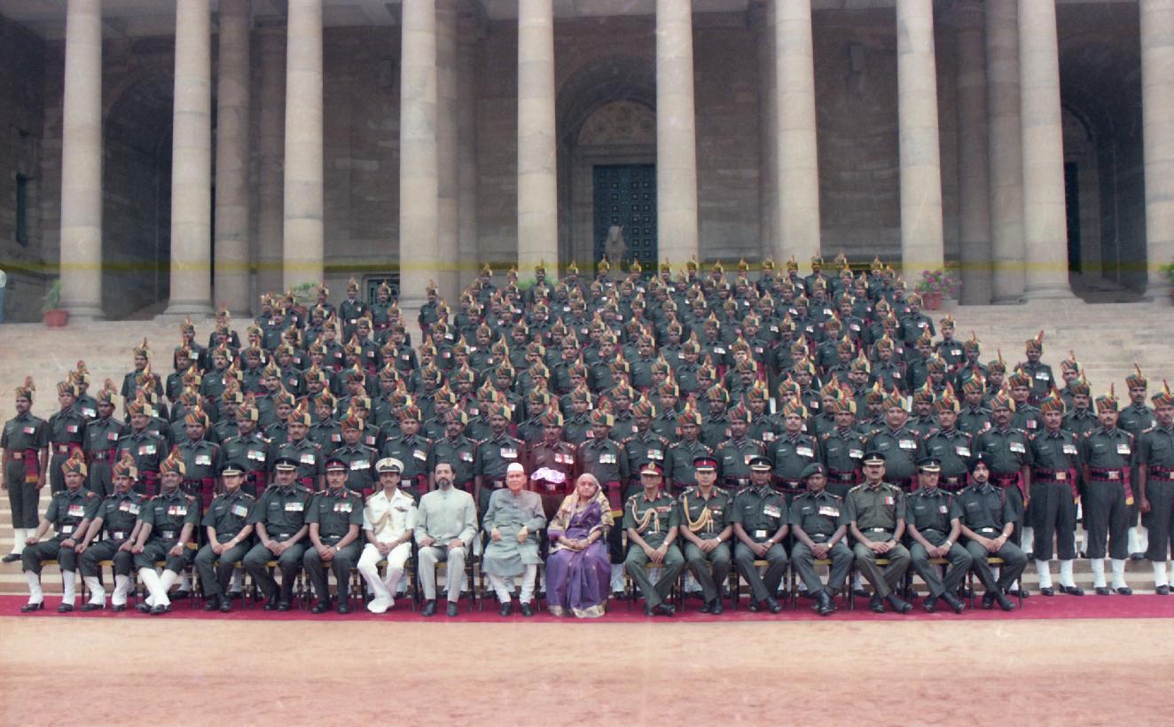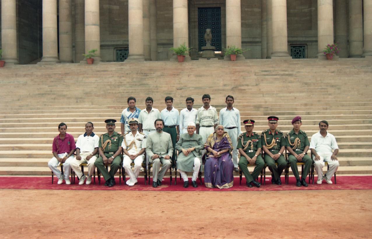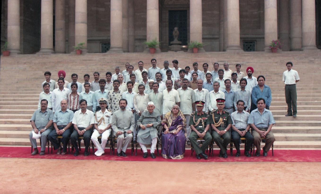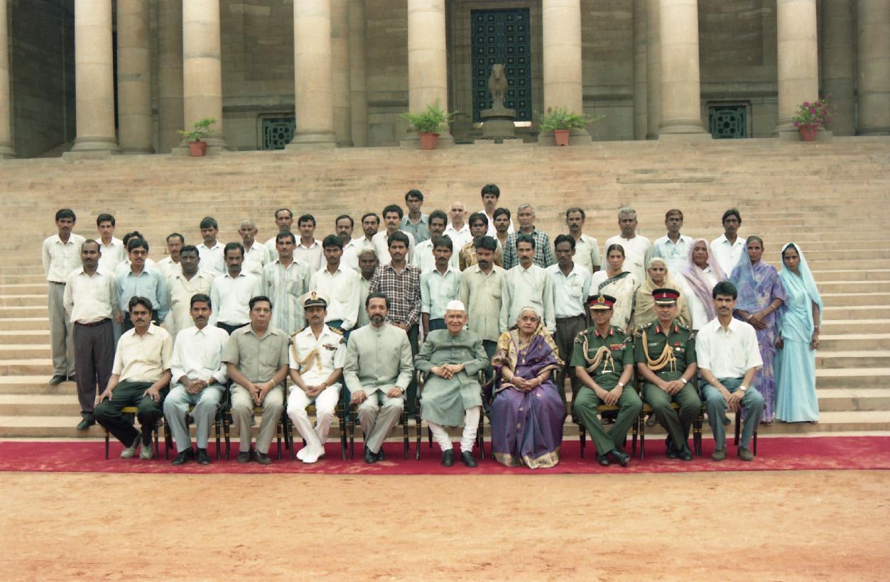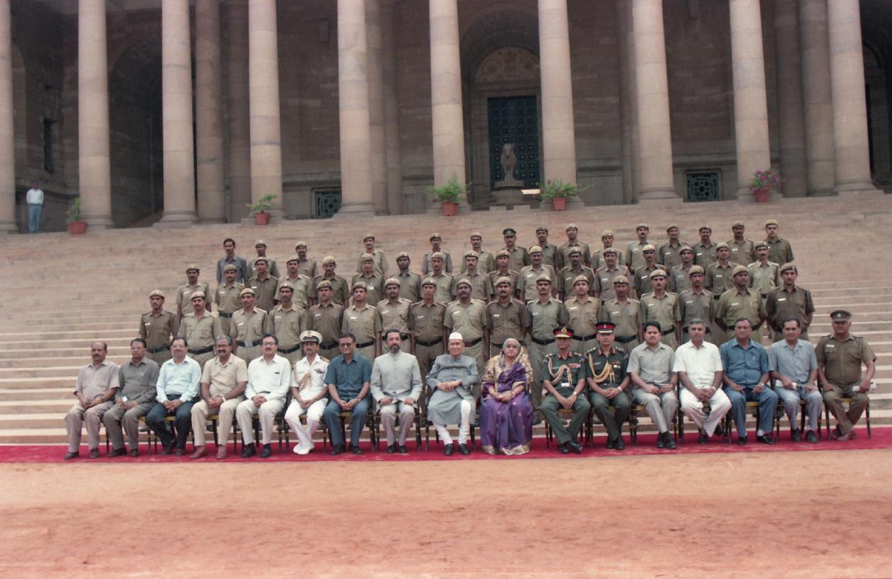 | Caption: | The President of India, Dr. Shankar Dayal Sharma presenting mementos to the PBG and 4 Bihar and poses for group photograph with Rashtrapati Bhavan staff and others, at Rashtrapati Bhavan in New Delhi on July 18, 1997 |
