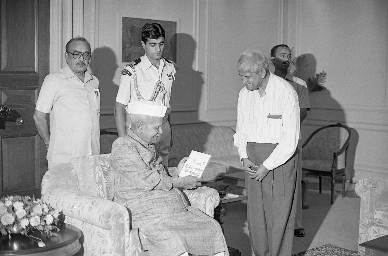 | Caption: | The President of India, Dr. Shankar Dayal Sharma receiving a copy of the book "Hindi Sahitya Ki Pravratiyan" from Dr. Jai Kishan Prasad Khandelwal at Rashtrapati Bhavan in New Delhi on September 03, 1996. |