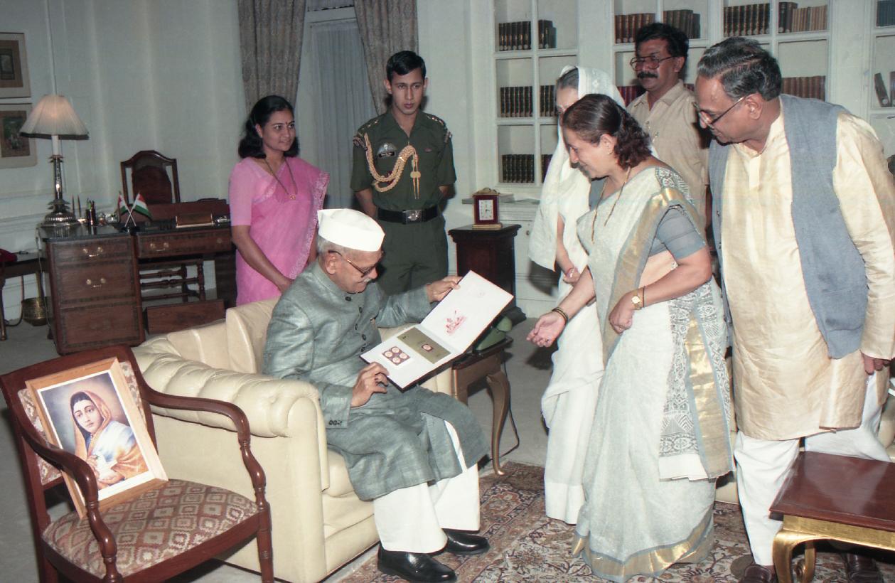 | Caption: | The President of India, Dr. Shankar Dayal Sharma receiving Postal Stamp on Devi Ahilyabai Holker from Smt. Sumitra Mahajan, MP(LS) with others at Rashtrapati Bhavan in New Delhi on September 09, 1996. |