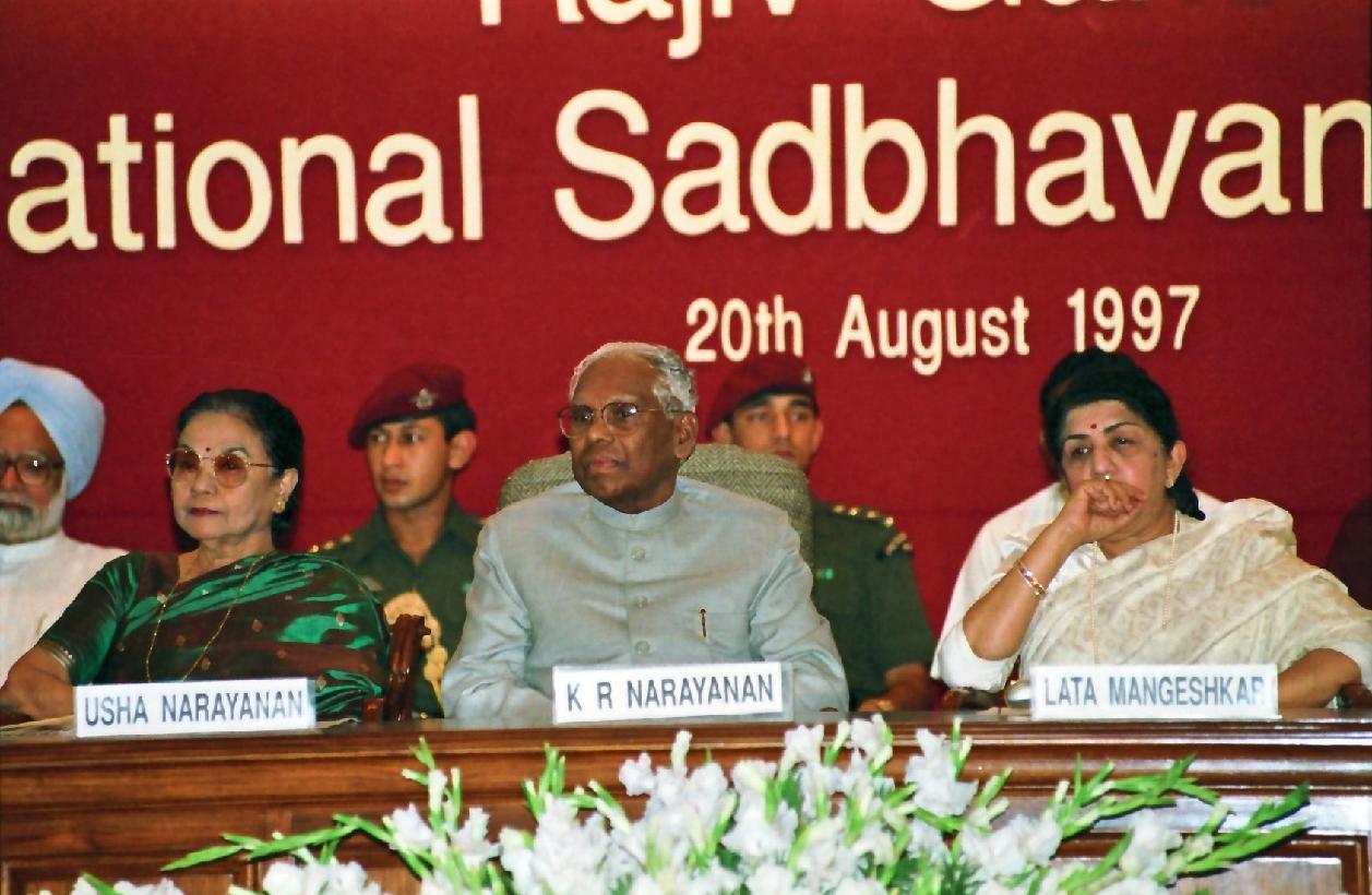 | Caption: | The President of India, Shri K R Narayanan presenting the Rajiv Gandhi National Sadbhavana Award to Ms Lata Mangeshkar at Jawahar Bhawan, Dr Rajendra Prasad Road in New Delhi on Aug 20, 1997 |