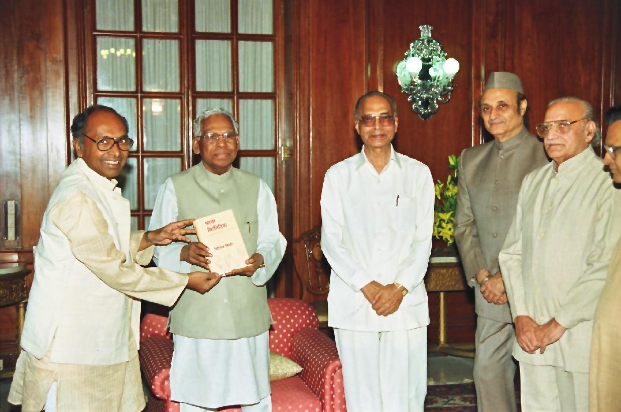 | Caption: | The President of India, Shri K R Narayanan during the Book Presentation a Copy of the Hindi Novel "Pehla Girmitya" by Shri Giriraj Kishore brought out by the Managing Trustee, Bharatiya Jnanpith Shri Ramesh Chandra at the Committee Room of Rashtrapati Bhavan in New Delhi on June 03, 1999 |