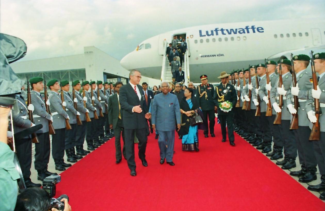| Caption: | The President of India, Shri K R Narayanan being welcomed at Bonn Military Airport in Germany on Sep 07, 1998 |