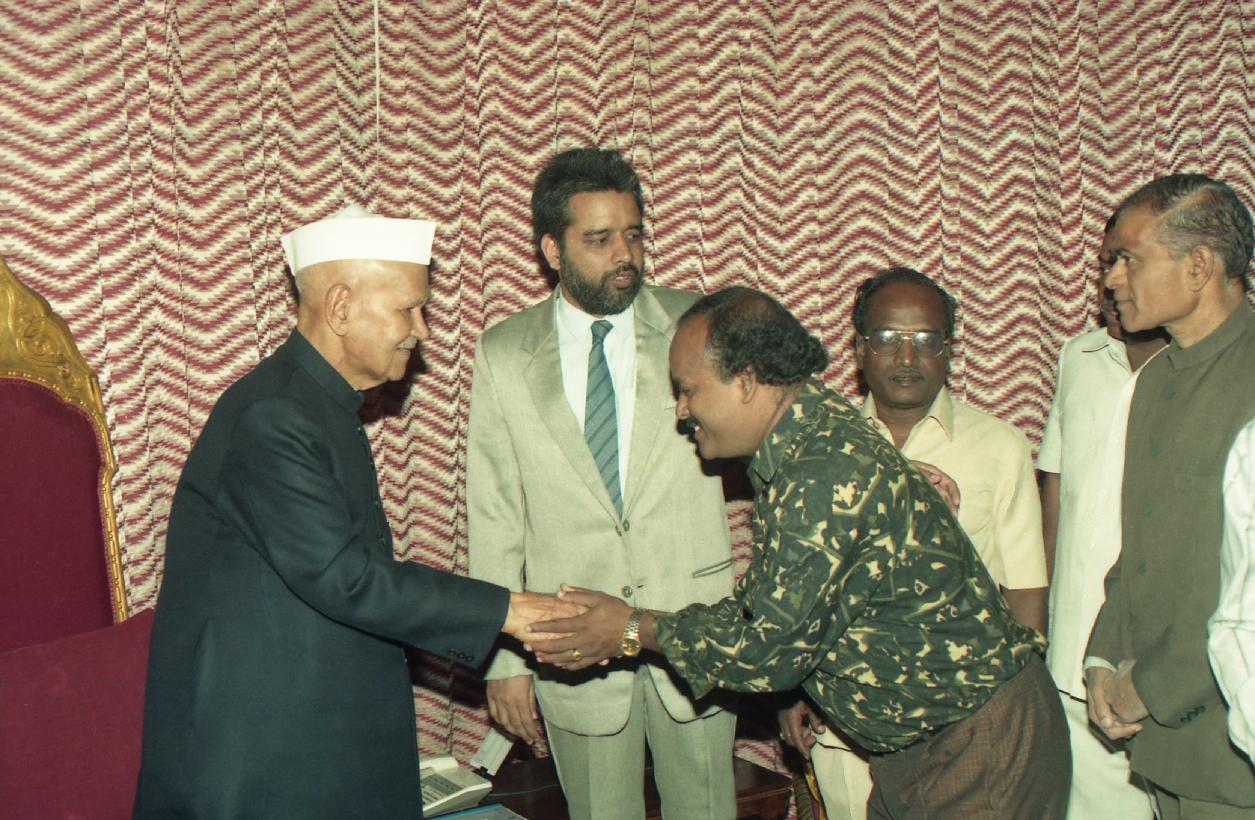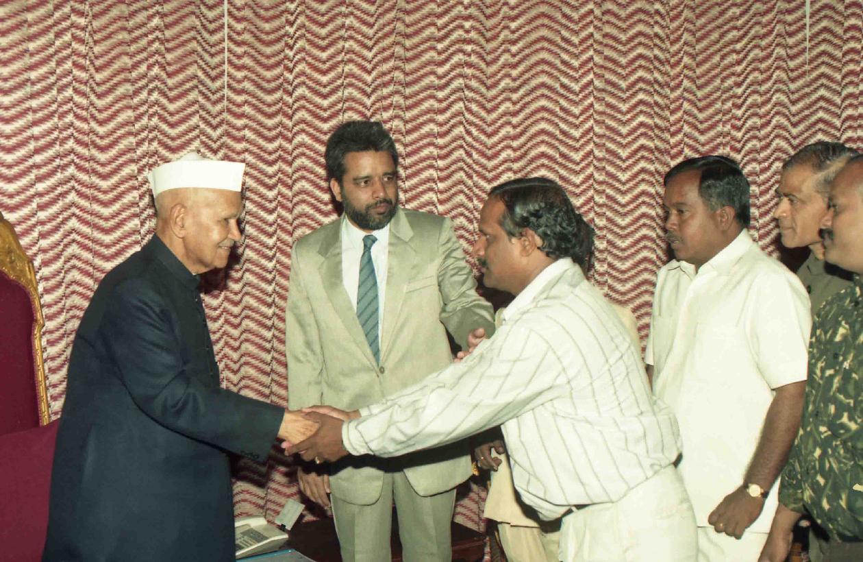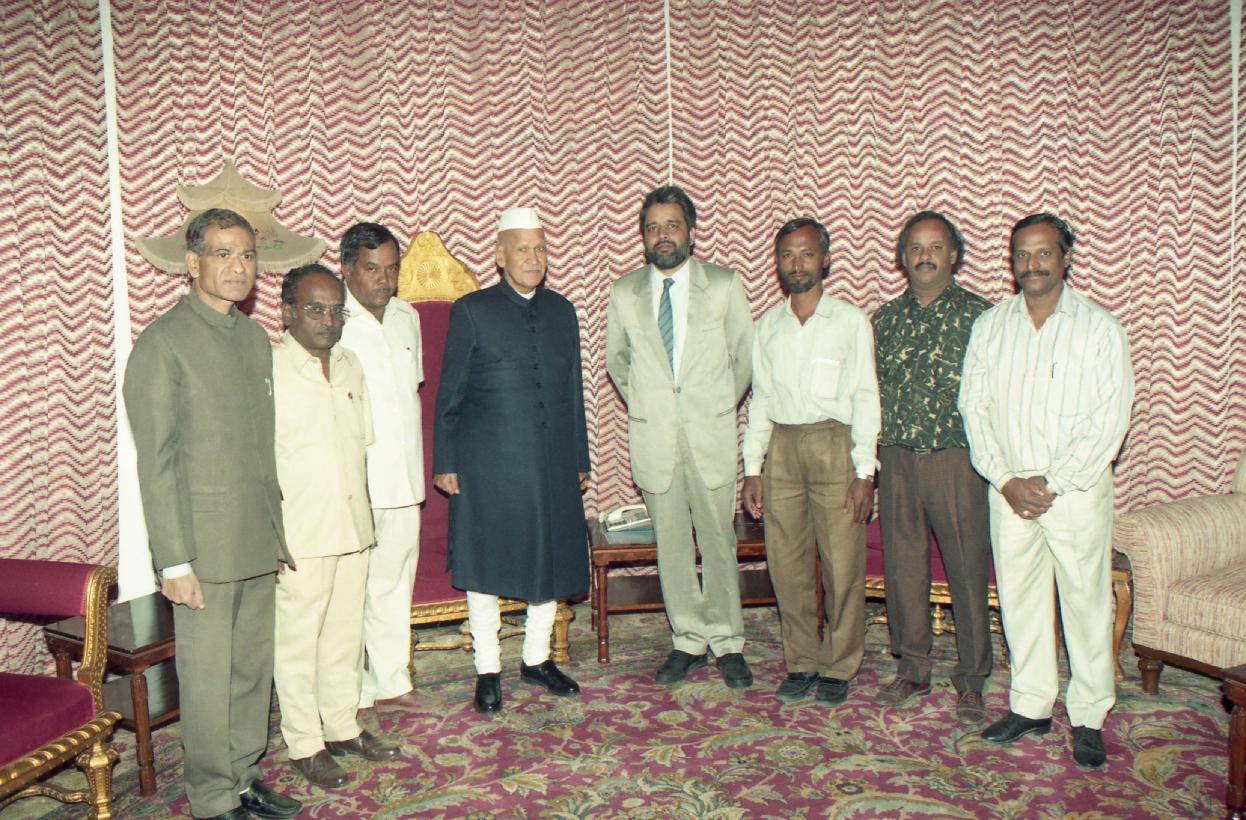 | Caption: | The President of India, Dr. Shankar Dayal Sharma meeting with Protocol officers, at Rashtrapati Nilayam, Hyderabad on November 07, 1996. |