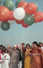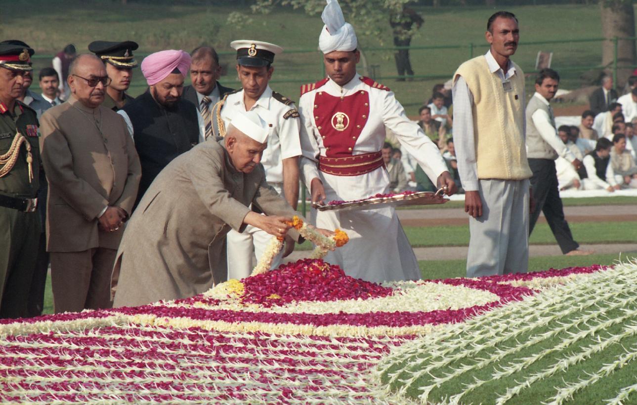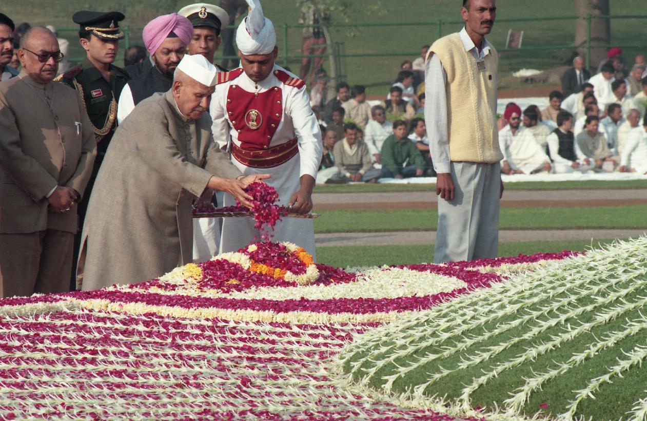 | Caption: | The President of India, Dr. Shankar Dayal Sharma paying floral tributes at the Samadhi of late Pandit Jawaharlal Nehru on his birth anniversary, at Shantivana, in New Delhi on November 14, 1996. |