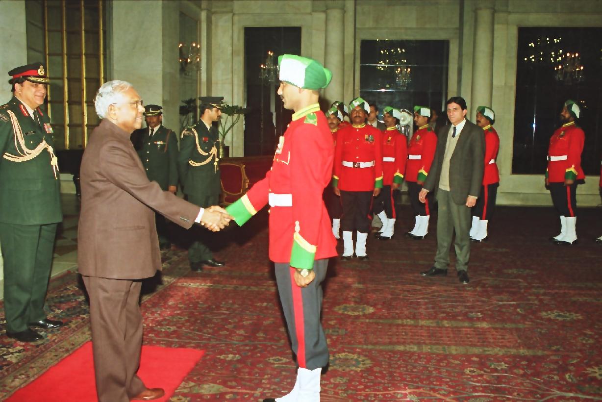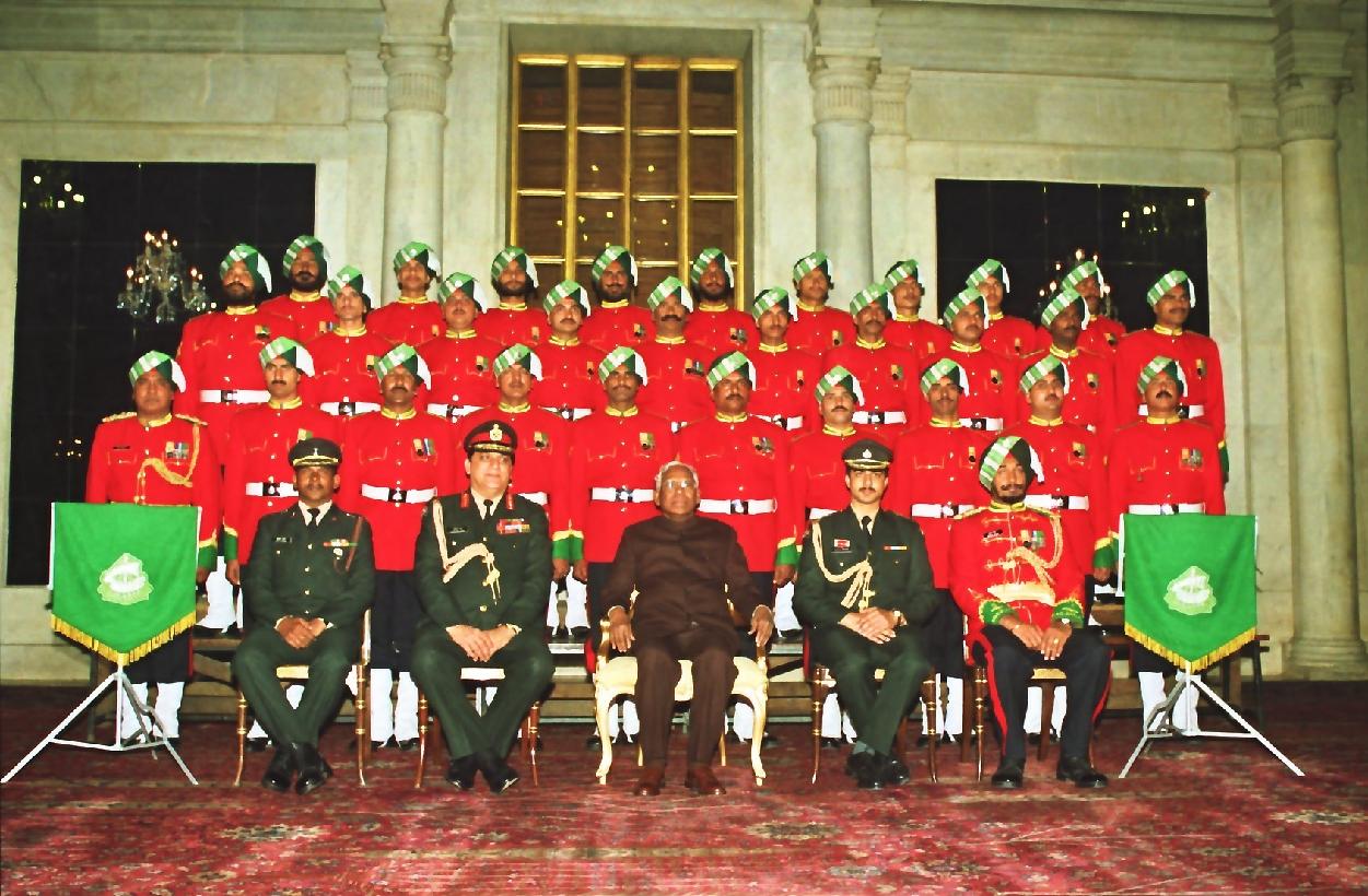 | Caption: | The President of India, Shri K R Narayanan posing for a Group Photograph with the Punjab Regt Centre Brass Band at the Ashok Hall of Rashtrapati Bhavan in New Delhi on Dec 31, 1998 |