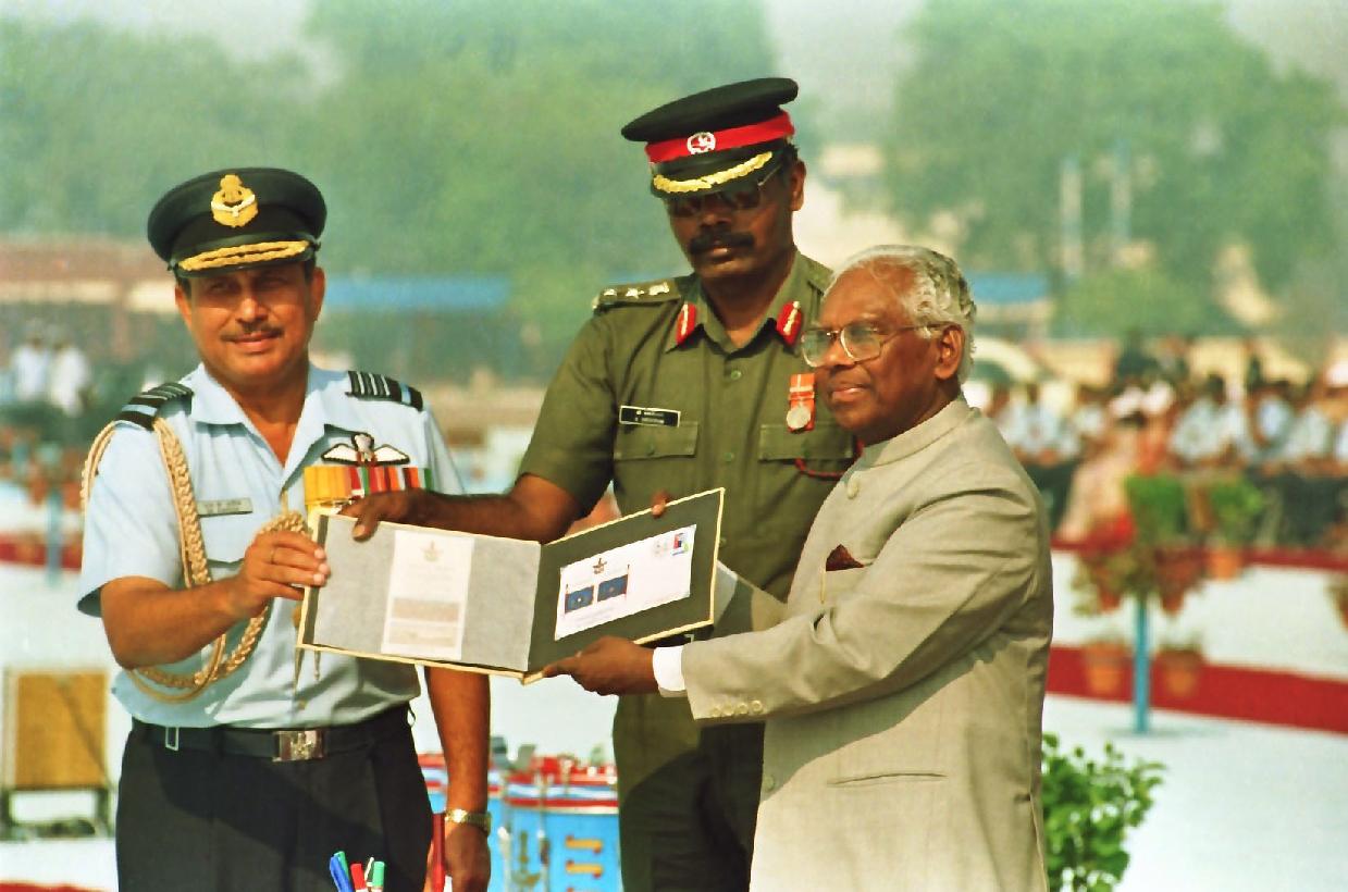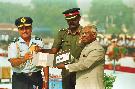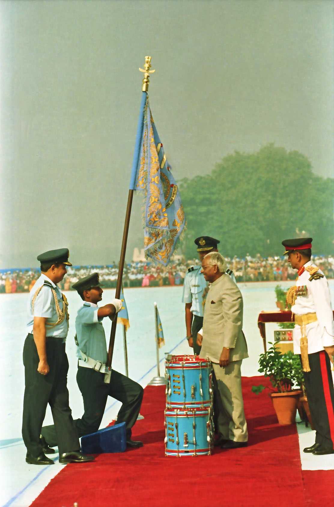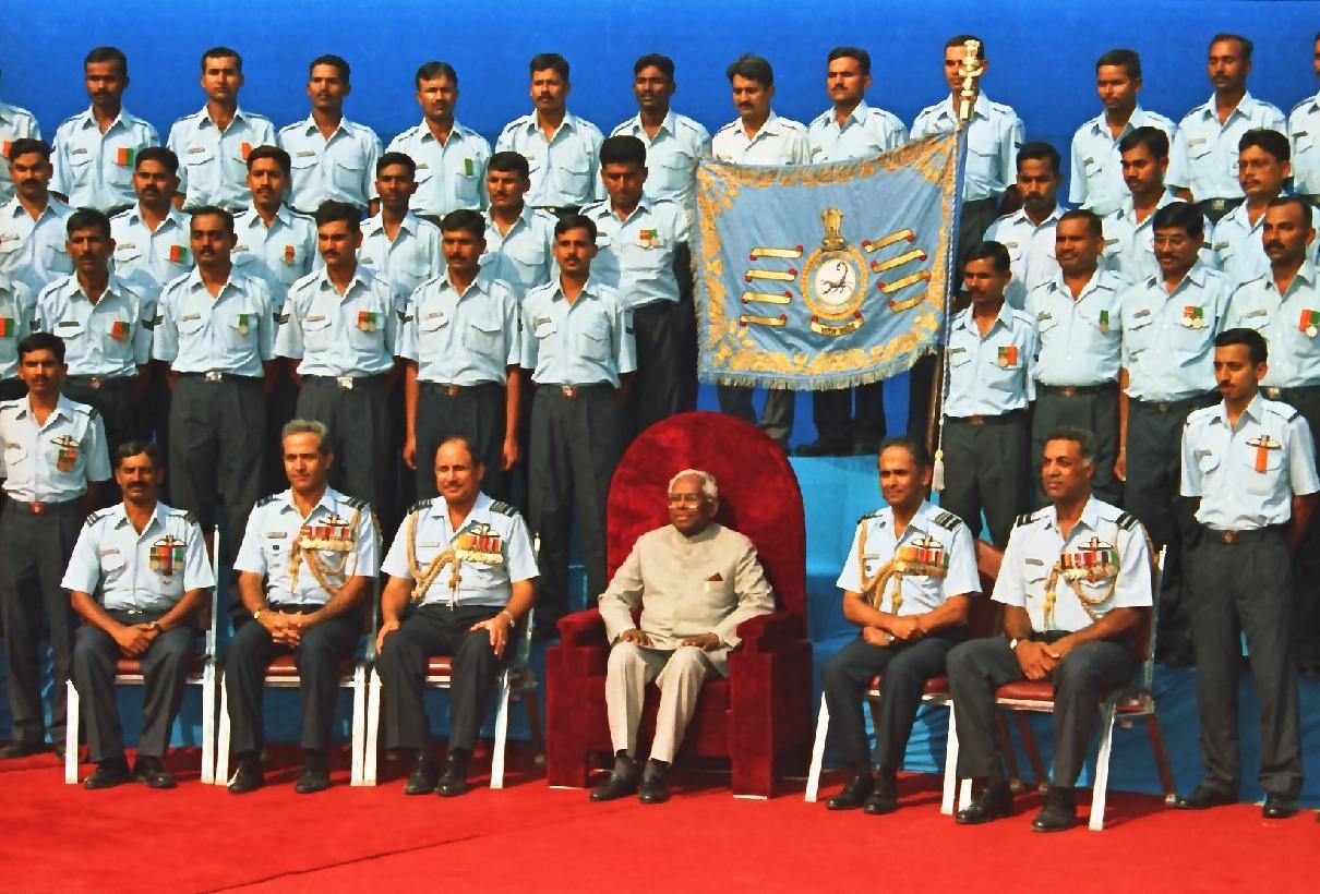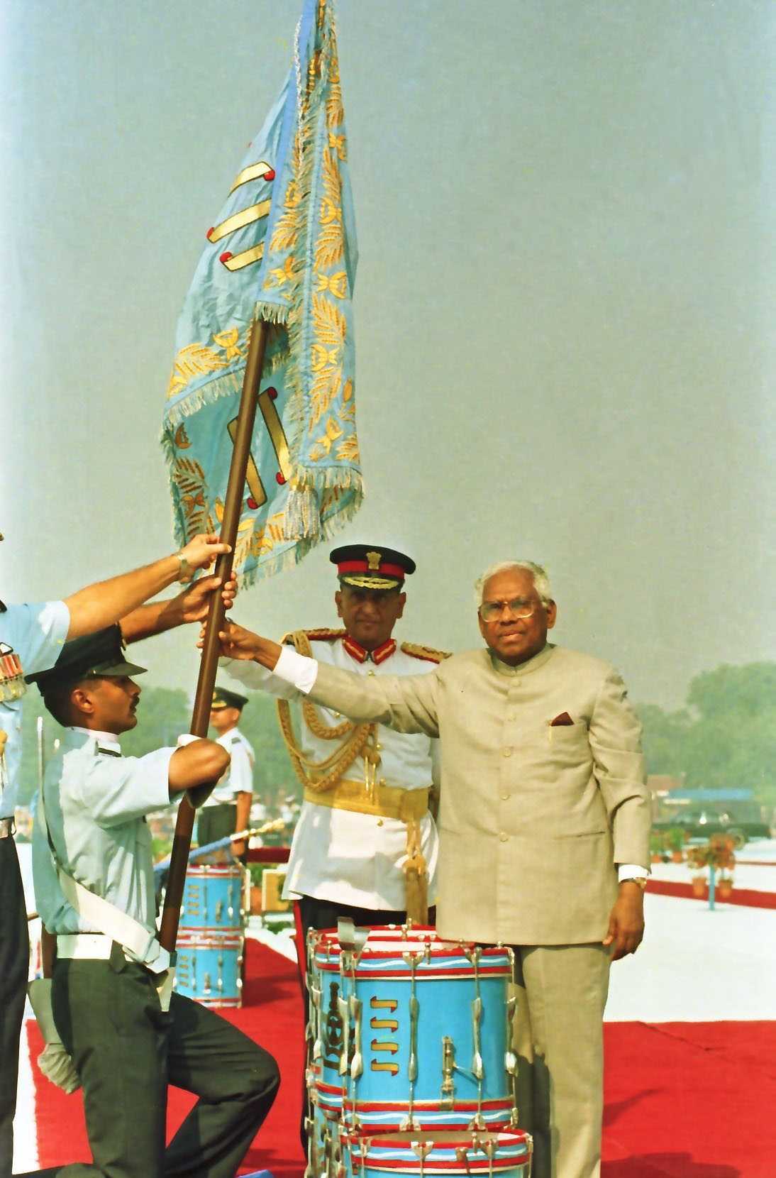 | Caption: | The President of India, Shri K R Narayanan presenting the Standard to 29 SQN and 41 SQN AF at Air Force Station Palam in New Delhi on Nov 07, 1997 |