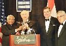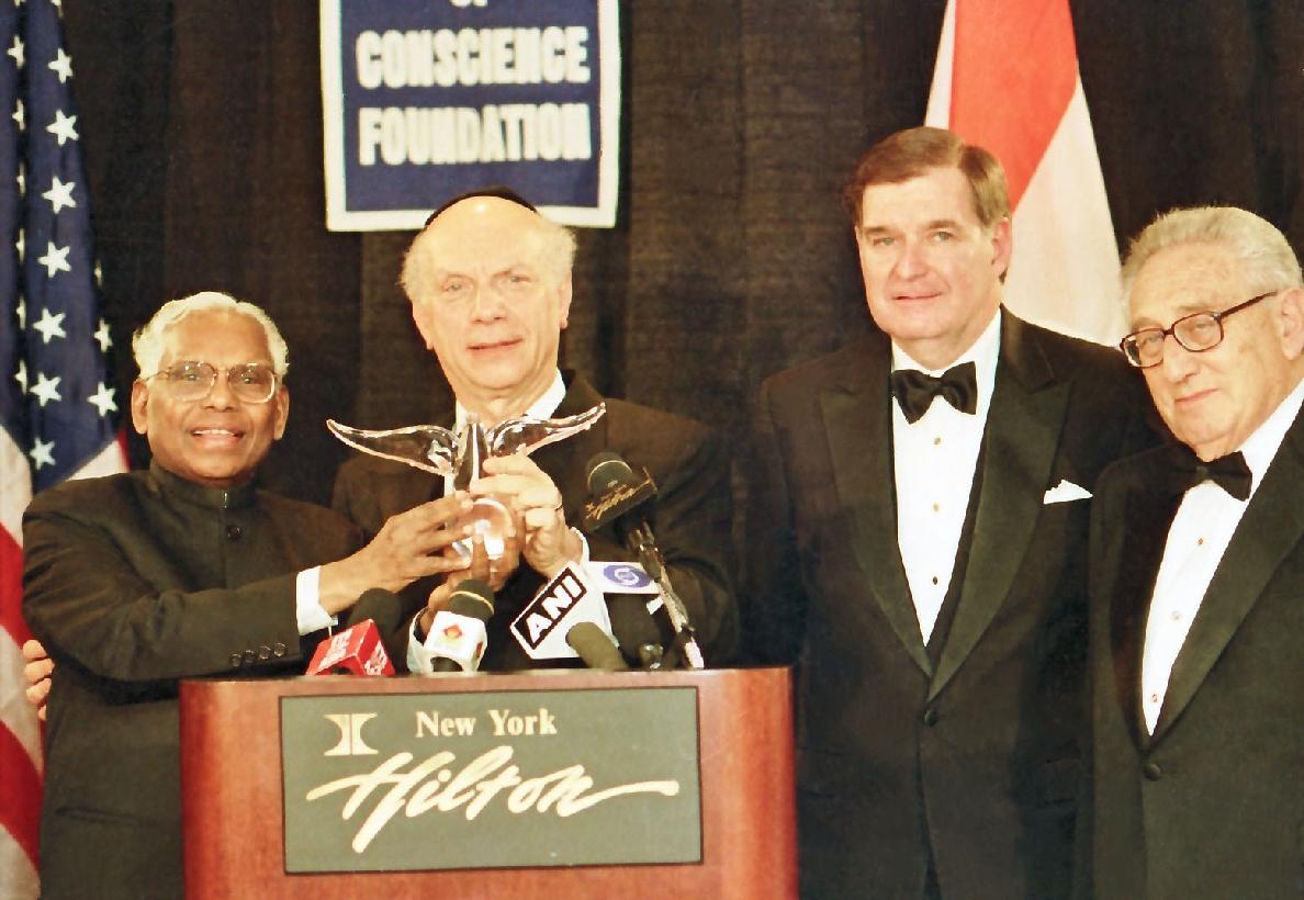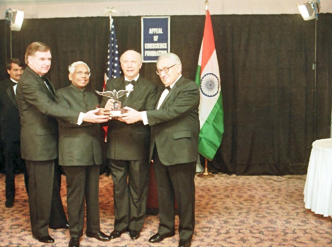 | Caption: | The President of India, Shri K R Narayanan receiving the "World Statesman Award" for the Year 1998 from the President of the Appeal of Conscience Foundation, Mr Rabbi Arthur at a Function at New York in USA on April 28, 1998 |