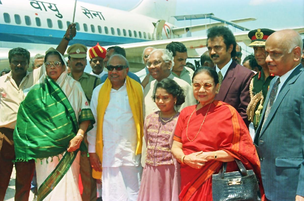 | Caption: | The President of India, Shri K R Narayanan being welcomed by the Governor of Tamil Nadu, Justice M Fathima Beevi and the Chief Minister of Tamil Nadu, Shri M Karunanidhi at Chennai Airport in Tamil Nadu on Sep 20, 1997 |