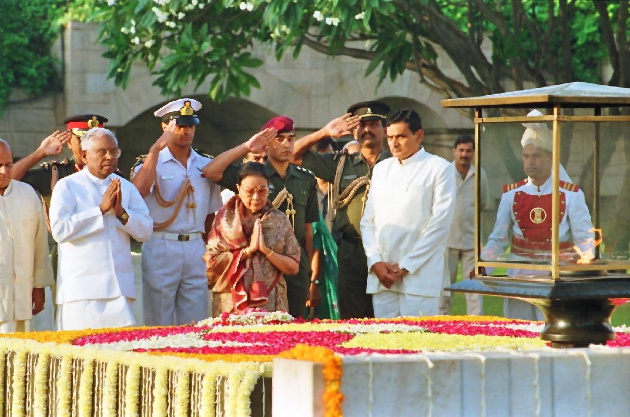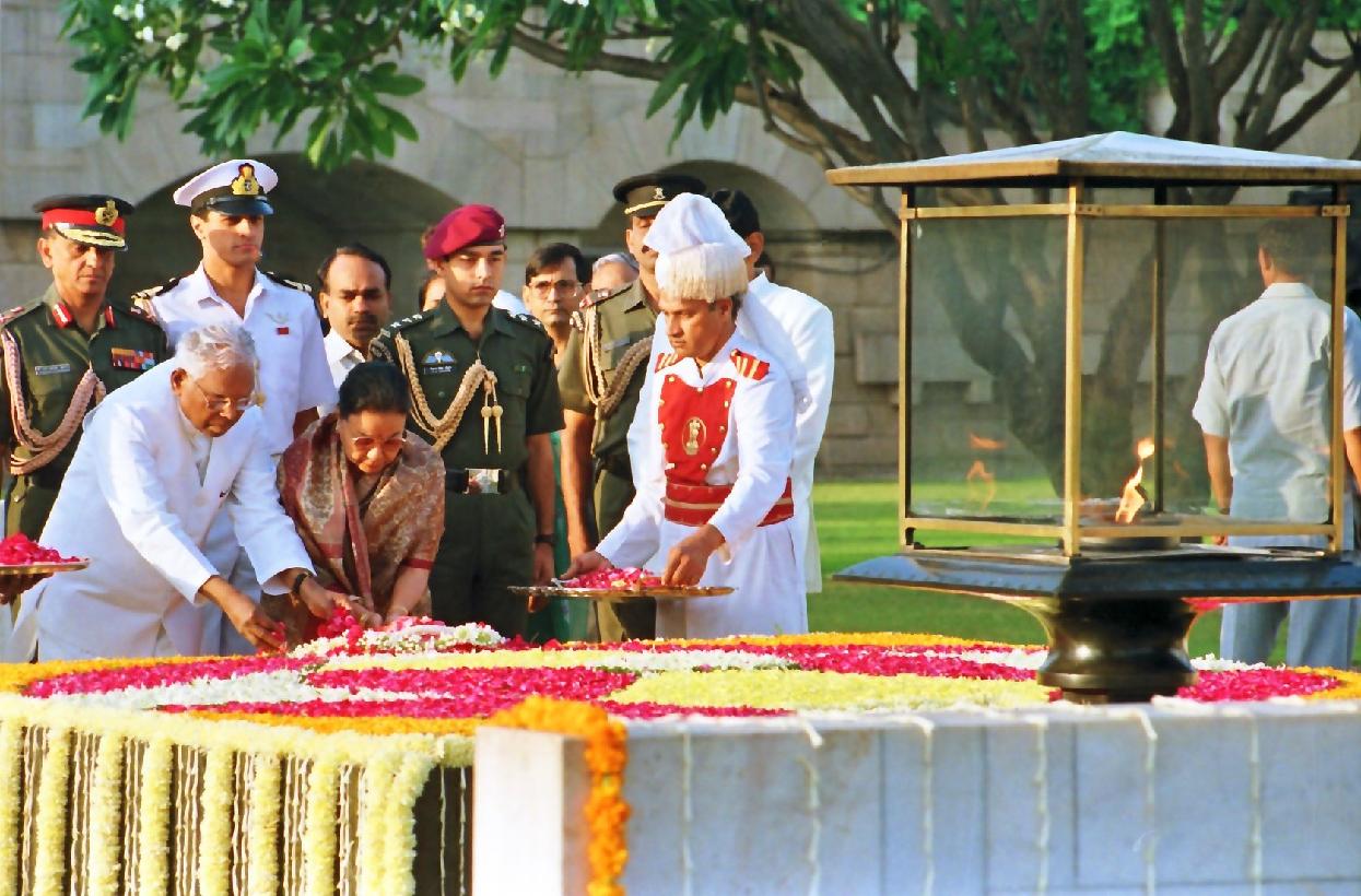 | Caption: | The President of India, Shri K R Narayanan paying homage at the Samadhi of the Father of Nation, Mahatma Gandhi on the occasion of his 128th Birth Anniversary at Rajghat in New Delhi on Oct 02, 1997 |
