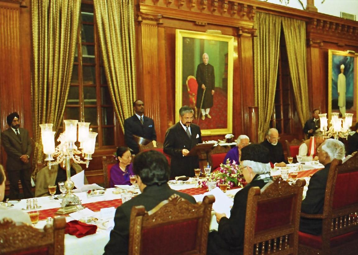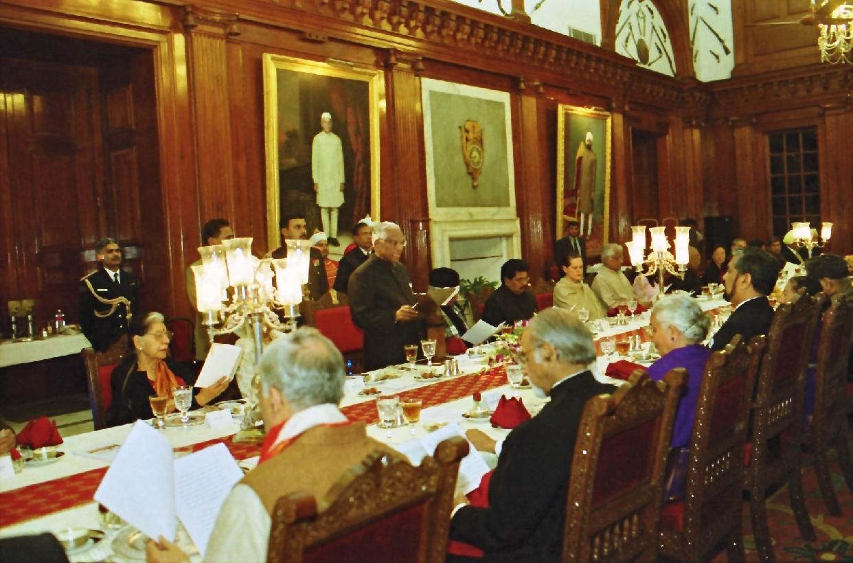 | Caption: | The President of India, Shri K R Narayanan at the Banquet Hosted in Honour of the Distinguished Guests of the President of the Republic of Mauritius, His Excellency Mr Cassam Uteem and his wife Zohra Uteem at the Banquet Hall of Rashtrapati Bhavan in New Delhi on Jan 25, 2002 |