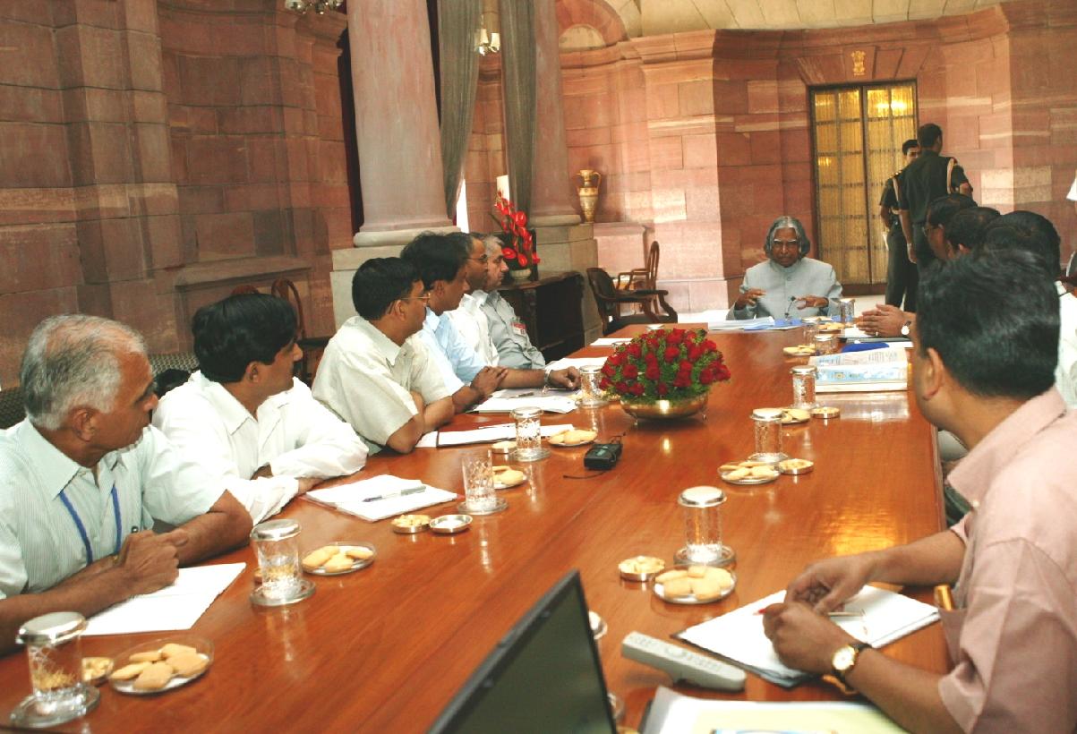 The President of India, Dr A P J Abdul Kalam interacting with the Director General, Dr S K Srivastava alongwith Dr R S Duttatreyam, Dr A K Shukla, Dr G Suresh, Dr Rajesh Prakash, Dr V Mukhopadhyaya from the Indian Meteorological Department (IMD) and Director, Department of Science and Technology, Shri Shambhu Singh at the Intellectual Room of Rashtrapati Bhavan in New Delhi on April 26, 2004 |
