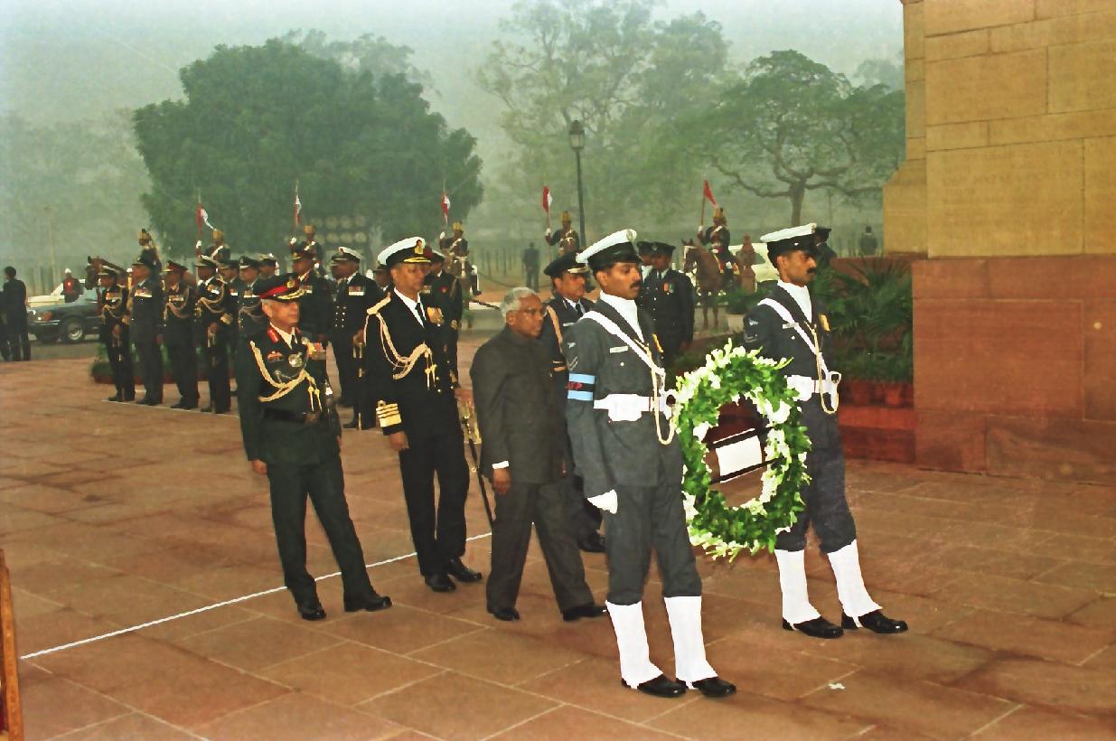 | Caption: | The President of India, Shri K R Narayanan laying a wreath at Amar Jawan Jyoti on Vijay Diwas at India Gate in New Delhi on Dec 16, 1998 |