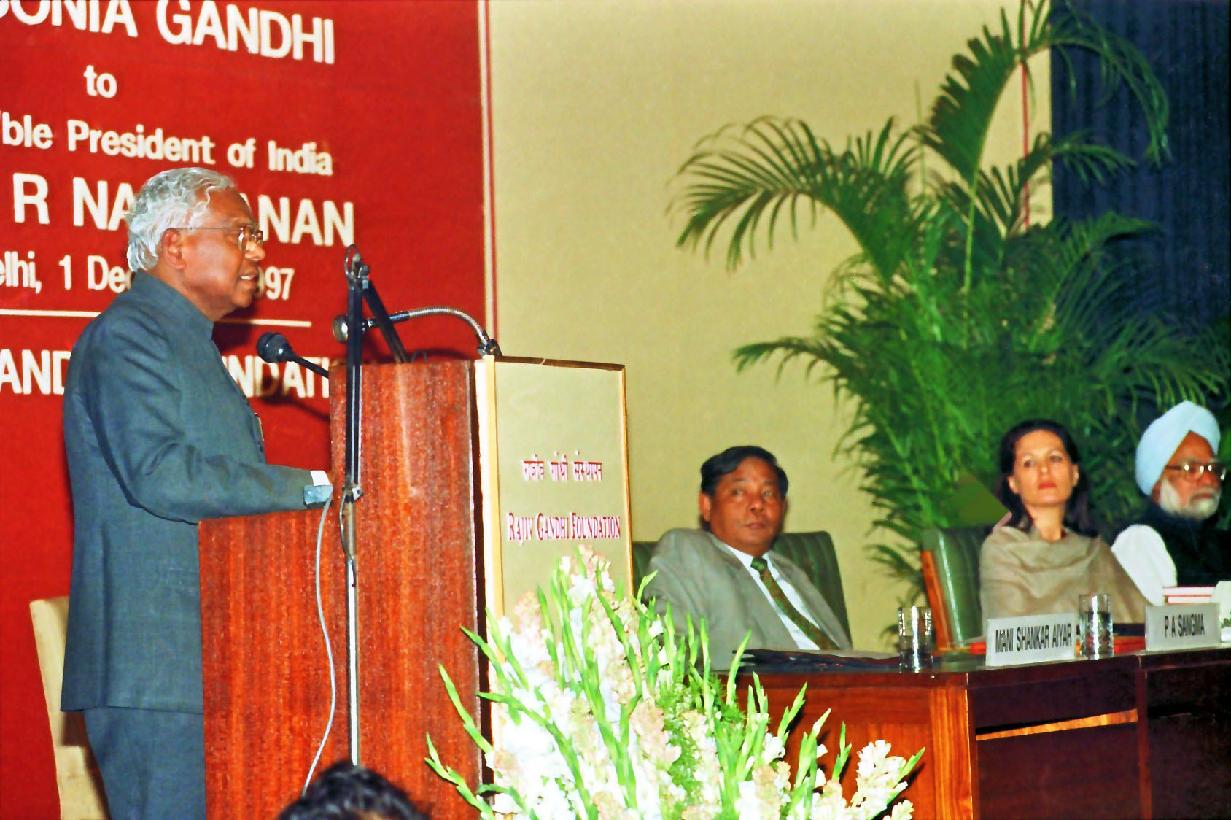 | Caption: | The President of India, Shri K R Narayanan during the Presentation of Four Volumes of Proceeding of "Rajiv Gandhi's India" and addressing on the Subject "India at Fifty" at Teen Murti House in New Delhi on Dec 01, 1997 |