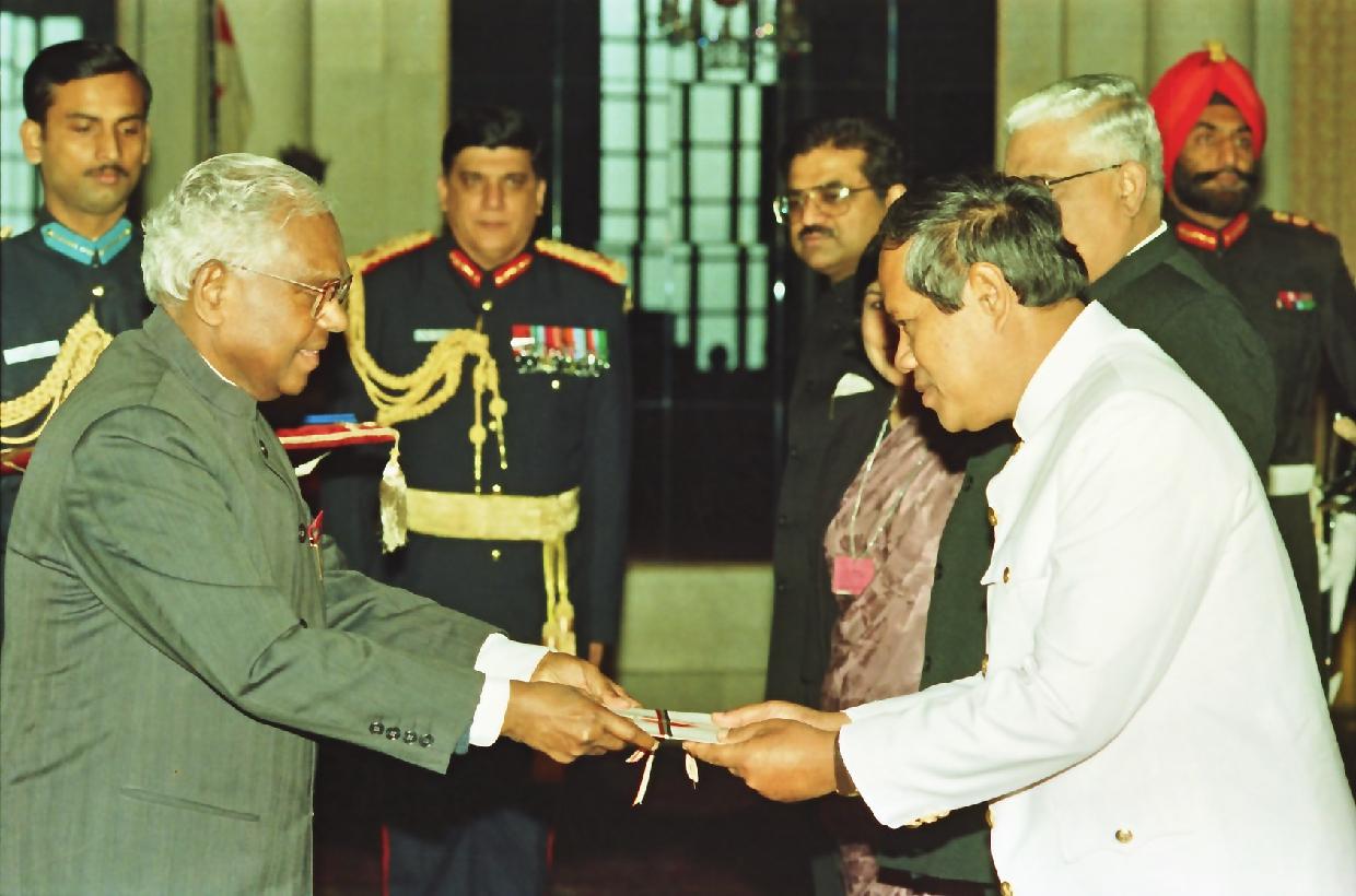 | Caption: | The Ambassador-Designate of the Kingdom of Cambodia to India, HE Mr Sim Suong presenting his credentials to the President of India, Shri K R Narayanan at the Ashok Hall of Rashtrapati Bhavan in New Delhi on Dec 12, 1997 |