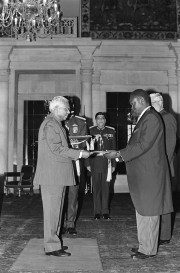 | Caption: | The Ambassador-Designate of the Republic to India, HE Mr Zephyr Mutanguha presenting his credentials to the President of India, Shri K R Narayanan at the Ashok Hall of Rashtrapati Bhavan in New Delhi on Dec 12, 1997 |