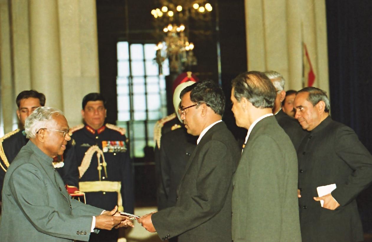 | Caption: | The Ambassador-Designate of the Republic of Suriname to India, His Excellency Mr Krishnedat Bajnath presenting his credentials to the President of India, Shri K R Narayanan at the Ashok Hall of Rashtrapati Bhavan in New Delhi on Jan 21, 2002 |