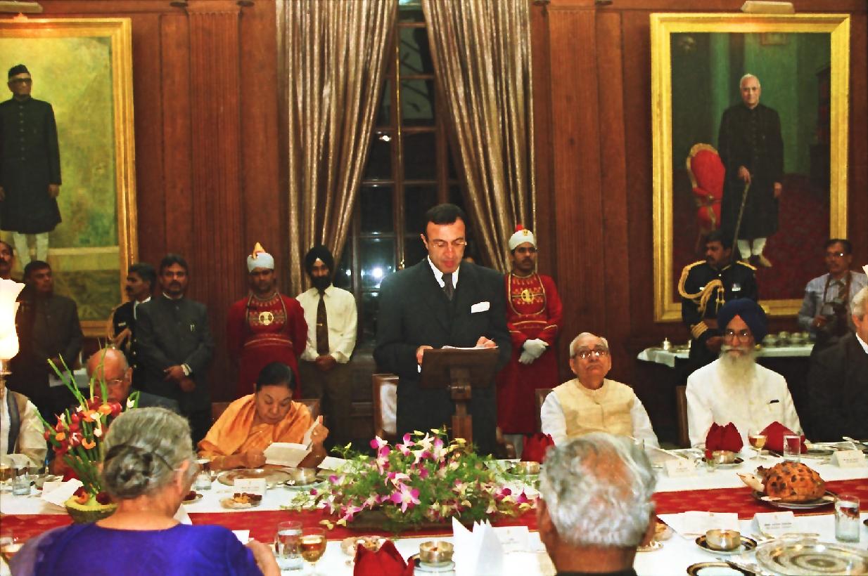 | Caption: | The President of India, Shri K R Narayanan at the Banquet Hosted in Honour of the Distinguished Guests of the President of the Republic of Bulgaria, HE Mr Petar Stoyanov and his wife Mrs Antonina Stoyanova at the Banquet Hall of Rashtrapati Bhavan in New Delhi on Oct 26, 1998 |
