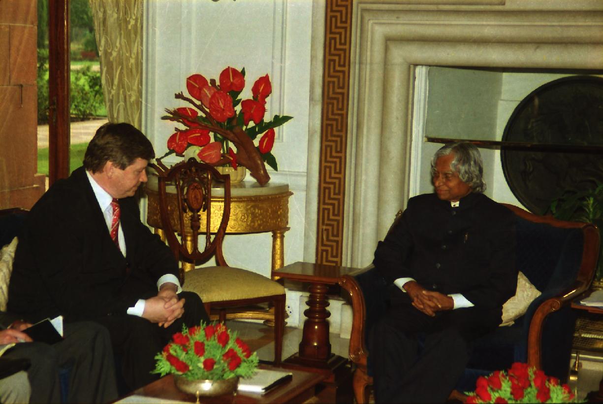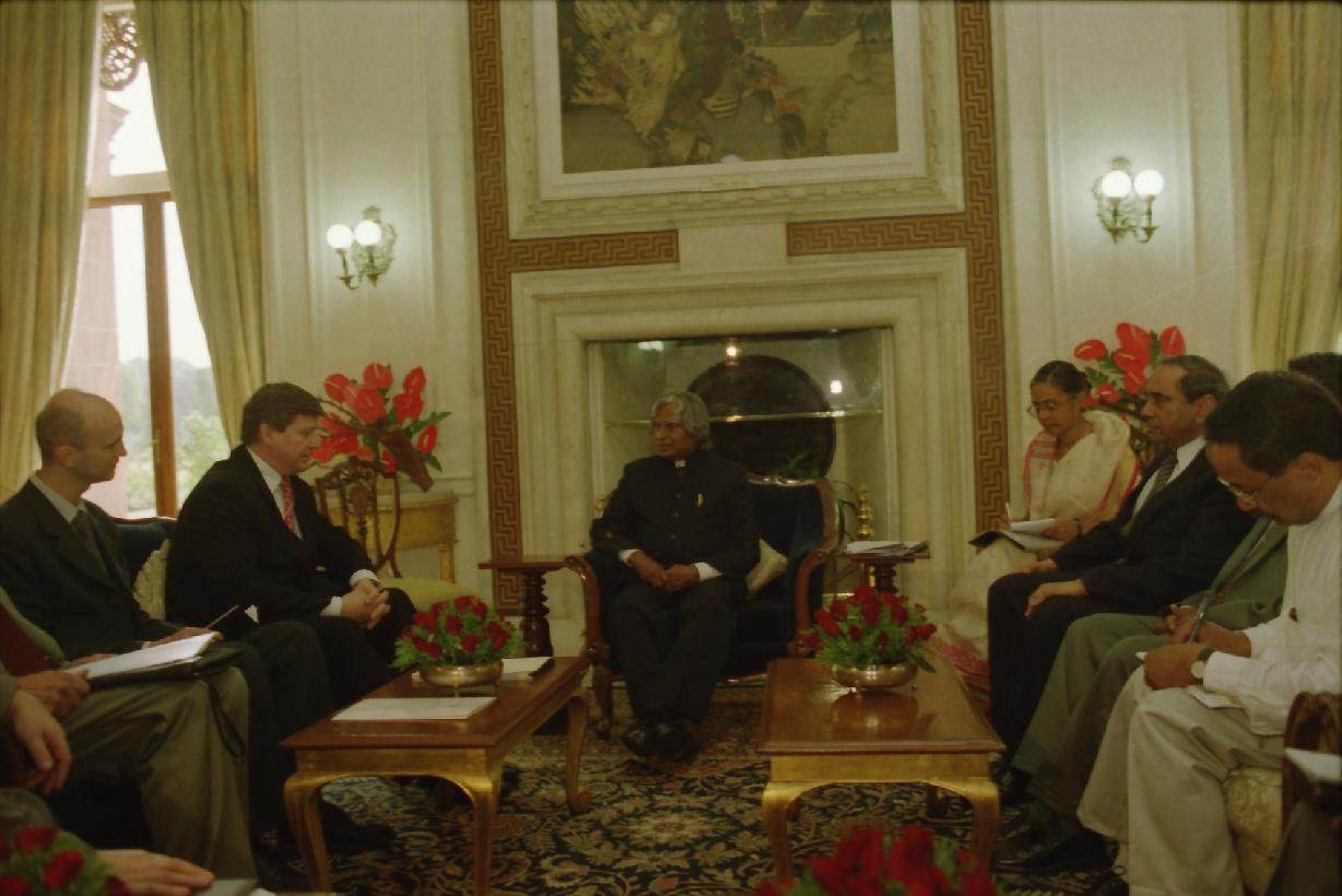 | Caption: | The President of India, Dr A P J Abdul Kalam meeting with the Minister of Foreign Affairs of the Republic of Belarus, HE Mr Mikhail M Khvostov at the Morning Room of Rashtrapati Bhavan in New Delhi on Aug 01, 2002 |