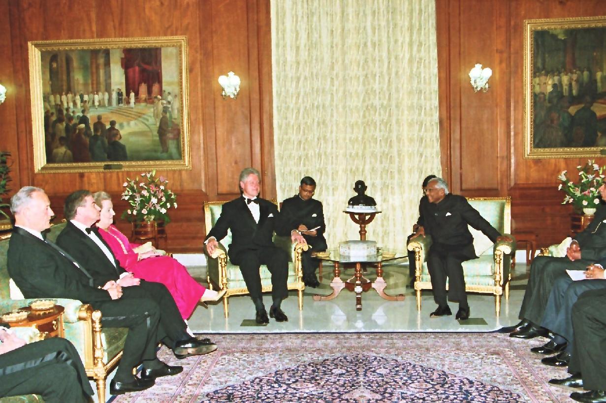 | Caption: | The President of the United States of America, HE Mr William J Clinton calling on the President of India, Shri K R Narayanan at the North Drawing Room of Rashtrapati Bhavan in New Delhi on March 21, 2000 |