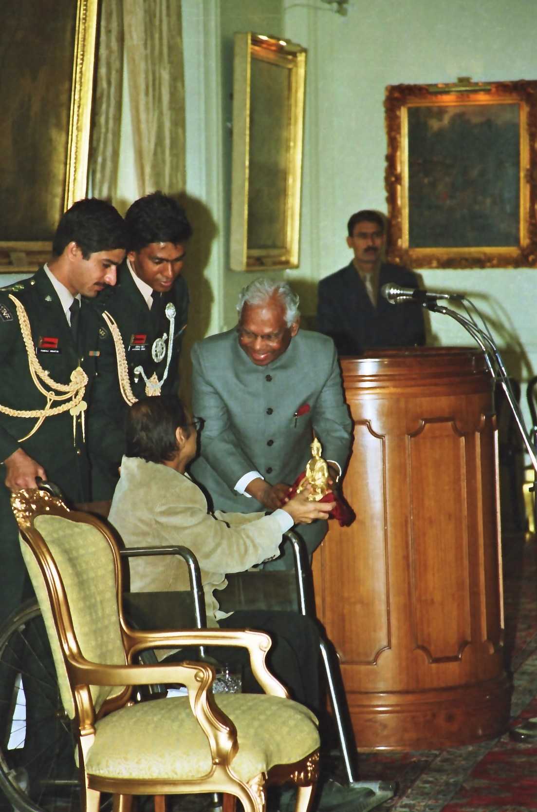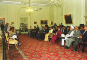 | Caption: | The President of India, Shri K R Narayanan being received a copy of the Book Green Politics Global Environmental Negotiations from Dr Anil Agarwal at the Yellow Drawing Room of Rashtrapati Bhavan in New Delhi on March 01, 2000 |