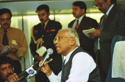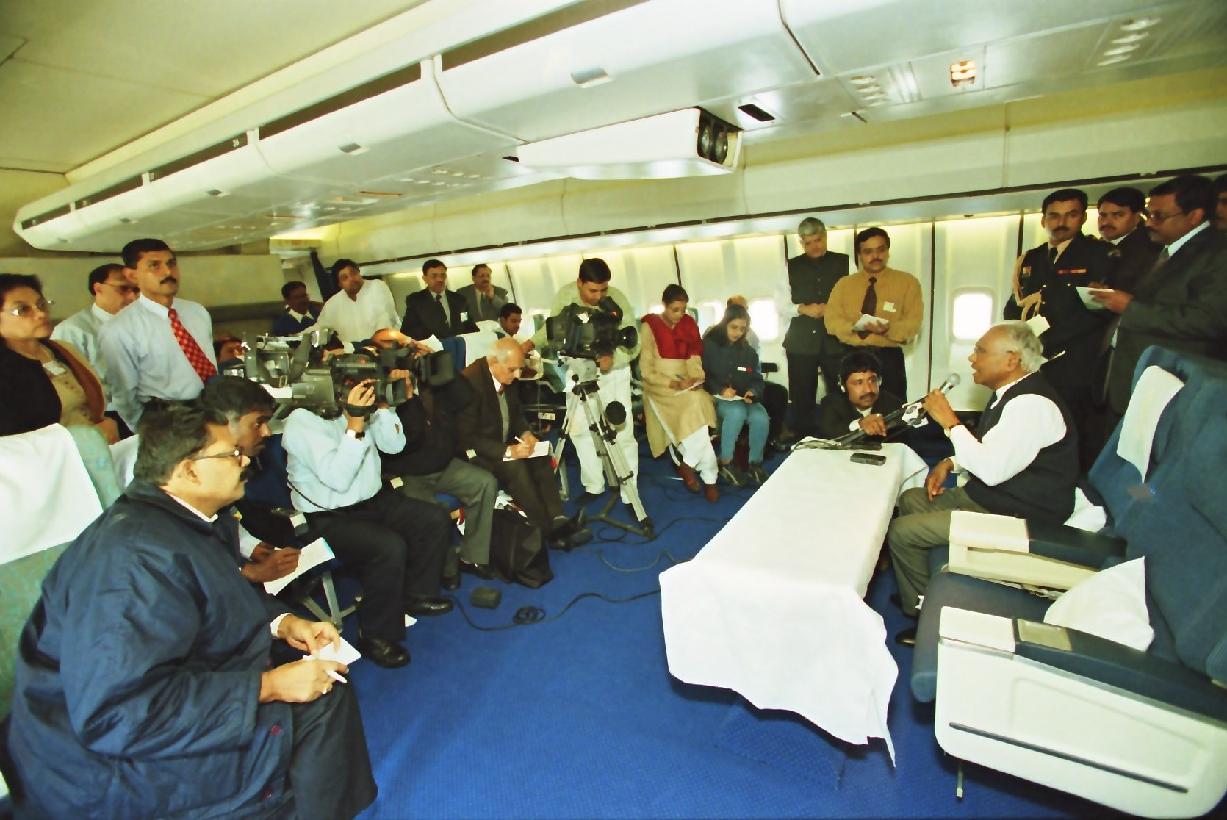 | Caption: | The President of India, Shri K R Narayanan interacting with the Media Person on Board after his Foreign Visit to Germany and Austria on Nov 10, 1999 |