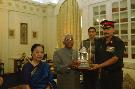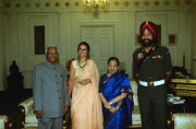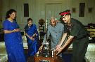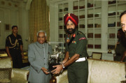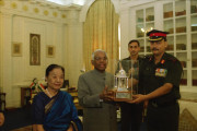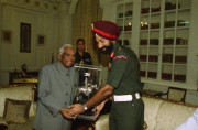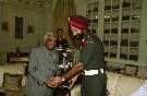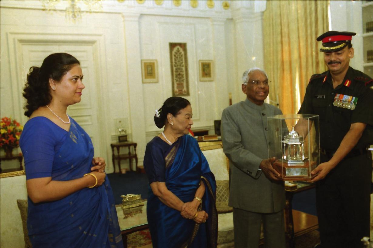 | Caption: | The President of India, Shri K R Narayanan at the Presentation of Mementos to the Commandant PBG and the CO, 7 RAJ RIF at the Study of Rashtrapati Bhavan in New Delhi on July 18, 2002 |