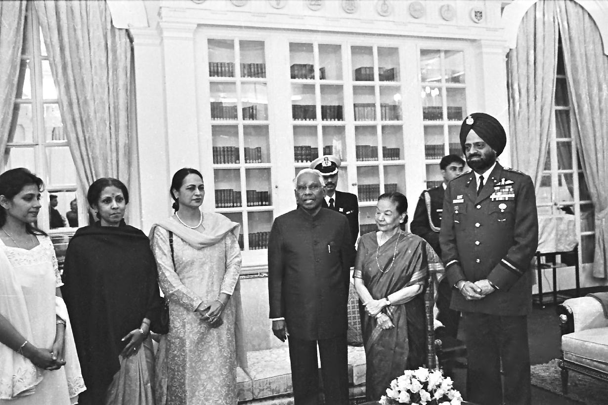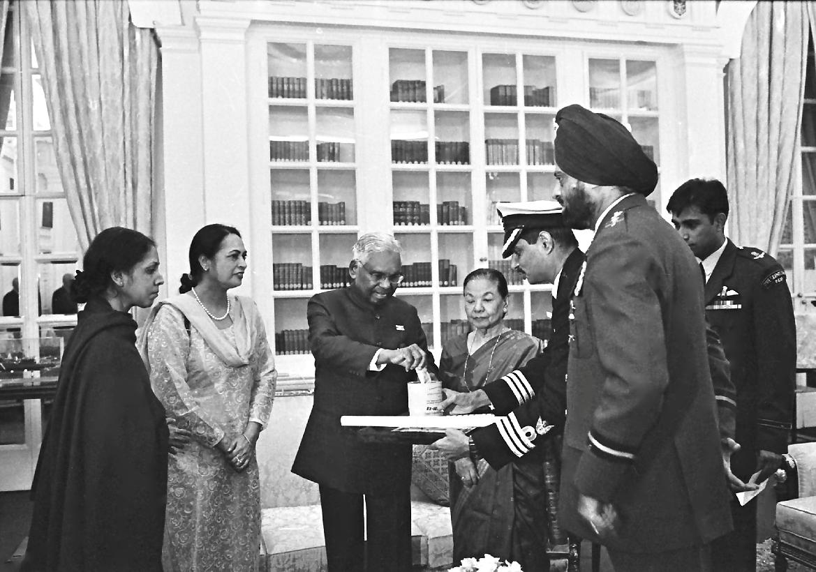 | Caption: | The President of India, Shri K R Narayanan with the Service Officers and Ladies from the Directorate General of Resettlement and the Kendriya Sainik Board to pinning a flag on the occasion of the Armed Forces Flag Day at the Rashtrapati Bhavan in New Delhi on Dec 07, 2000 |