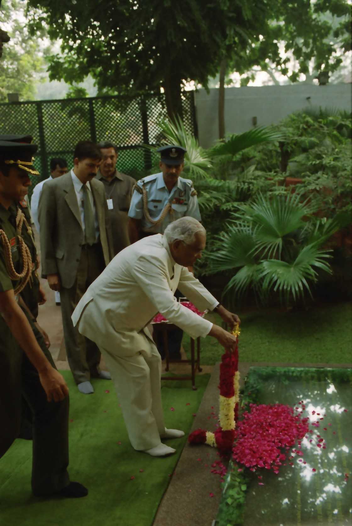 | Caption: | The President of India, Shri K R Narayanan paying homage to the Former Prime Minister of India, Late Smt Indira Gandhi on the occasion of her Death Anniversary at No-1 Safdarjung Road in New Delhi on Oct 31, 2001 |