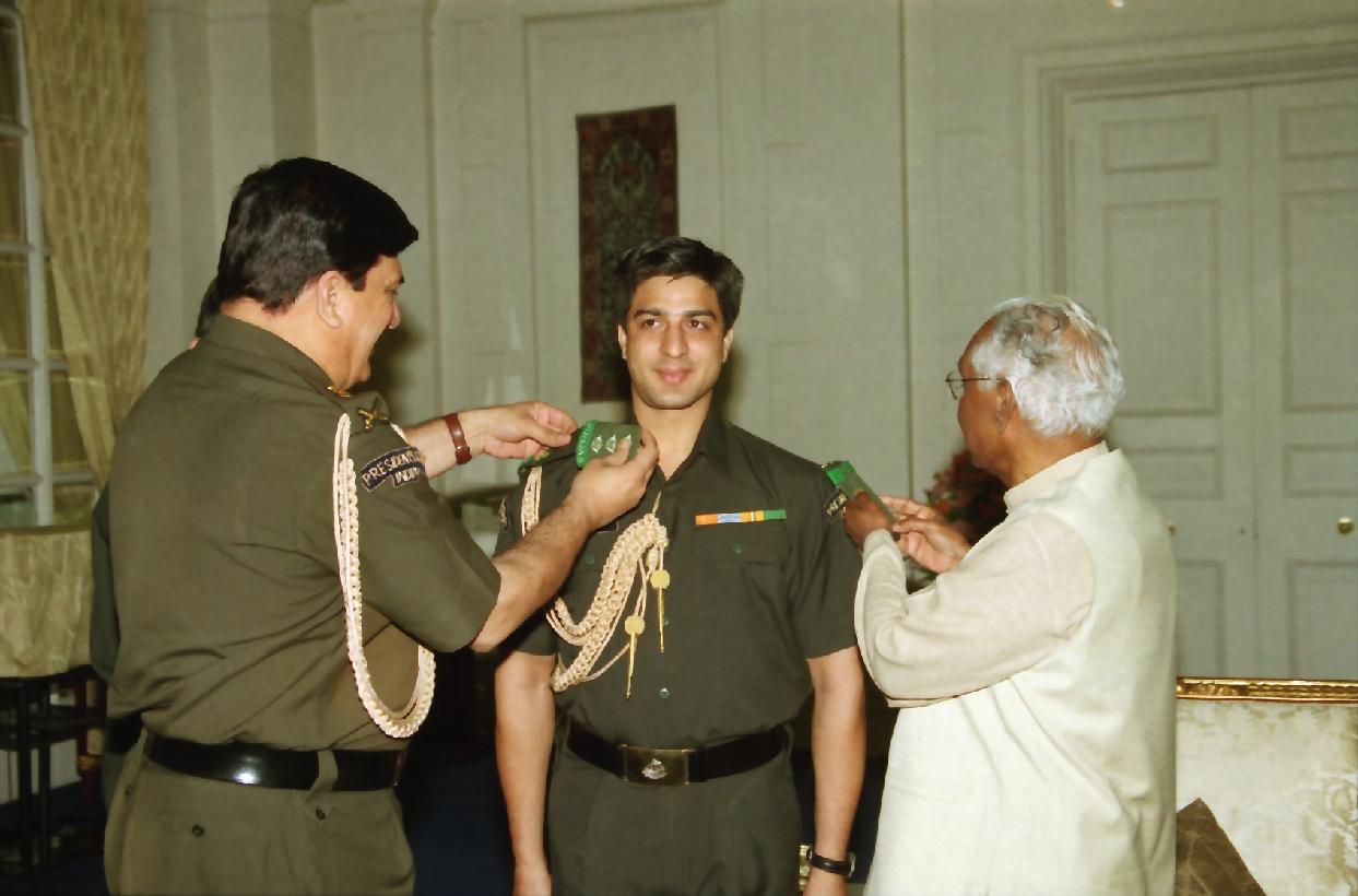 | Caption: | The President of India, Shri K R Narayanan pinning a Rank on Capt Pankaj Awasthi at the Rashtrapati Bhavan in New Delhi on June 18, 2002 |