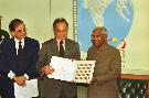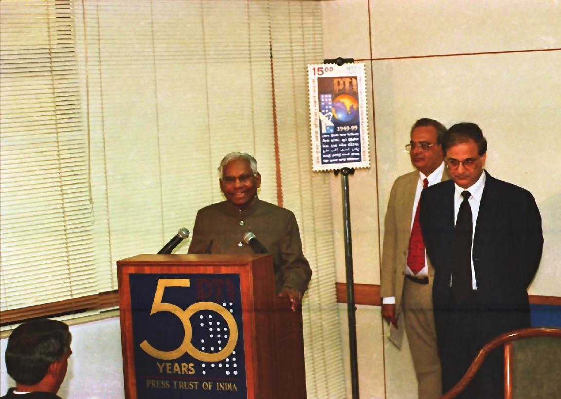 | Caption: | The President of India, Shri K R Narayanan releasing a Stamp on the Golden Jubilee Celebrations of PTI at PTI Building in New Delhi on March 05, 1999 |