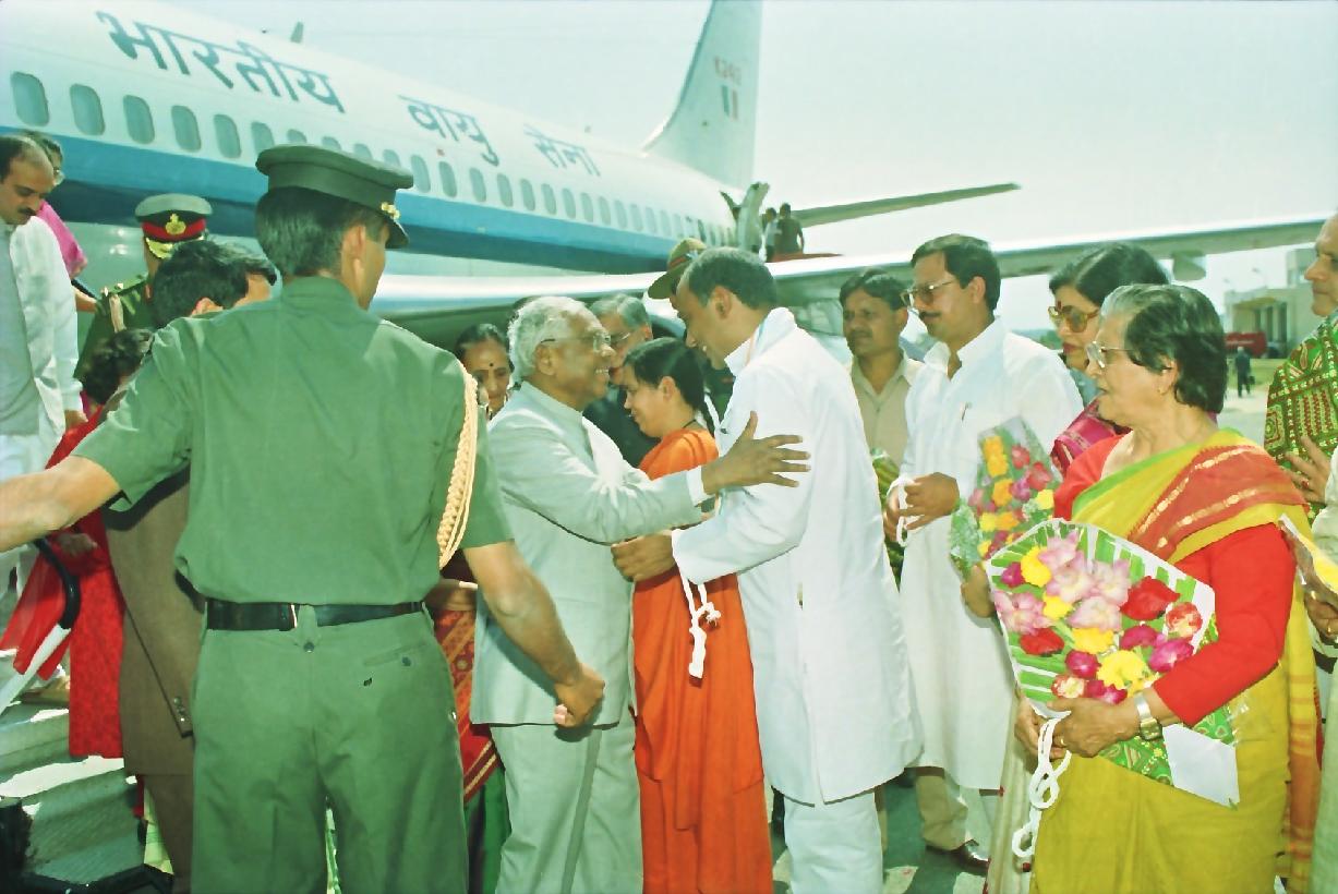 | Caption: | The President of India, Shri K R Narayanan being welcomed by the Governor of Madhya Pradesh, Dr Bhai Mahavir and the Chief Minister of Madhya Pradesh, Shri Digvijay Singh at Khajuraho Airport in Madhya Pradesh on March 06, 1999 |