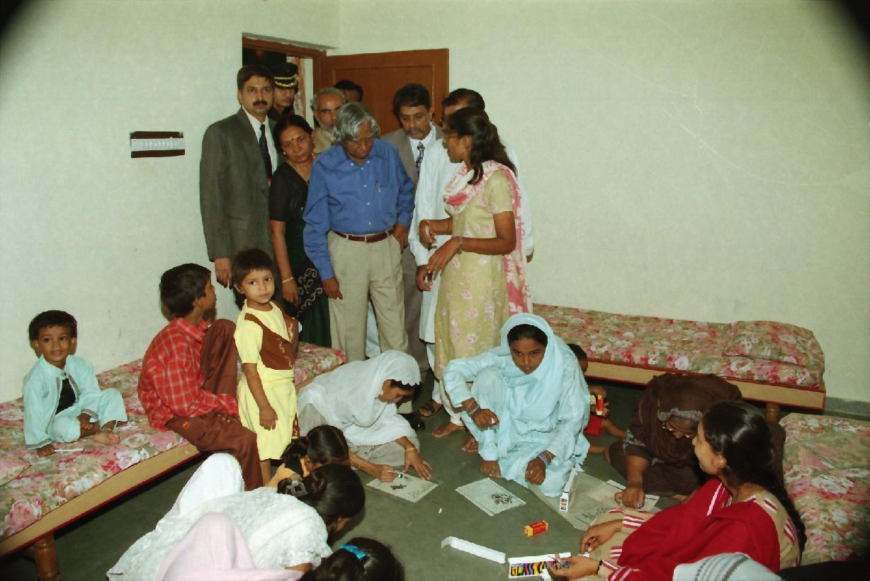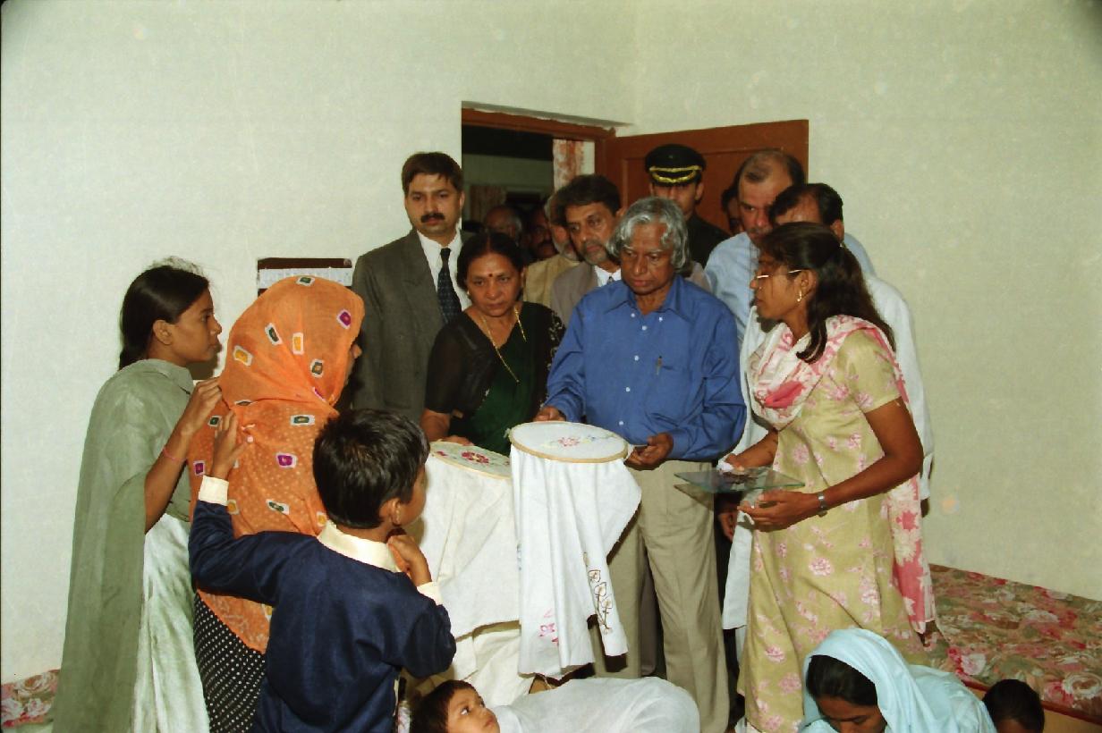 | Caption: | The President of India, Dr A P J Abdul Kalam visiting to the Widow House in Gujarat on Aug 12, 2002 |