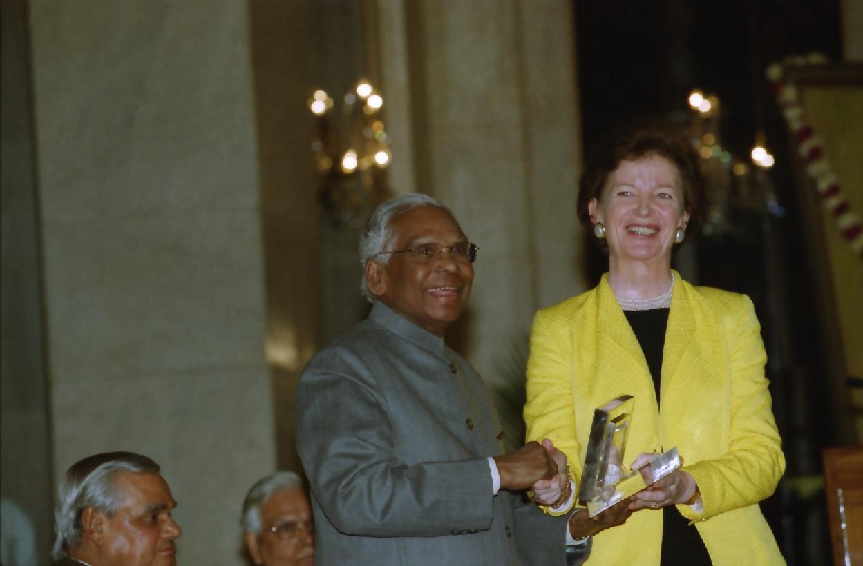 | Caption: | The President of India, Shri K R Narayanan presenting the Indira Gandhi Prize for 2000 to the UN High Commissioner for Human Rights, HE Mrs Mary Robinson at the Ashok Hall of Rashtrapati Bhavan in New Delhi on Nov 19, 2001 |