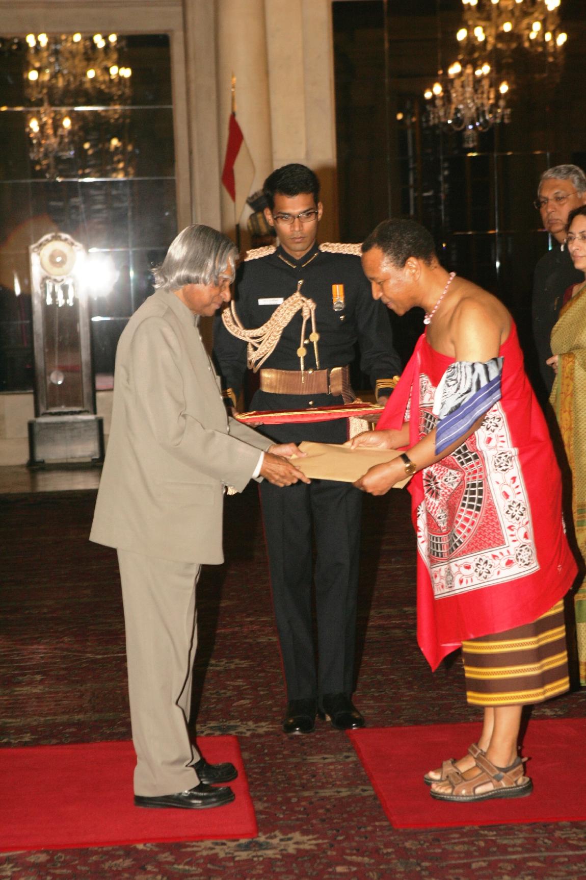 | Caption: | The High Commissioner-Designate of the Kingdom of Swaziland to India, HE Mr Mpumelelo Joseph Ndumiso Hlophe presenting his credentials to the President of India, Dr A P J Abdul Kalam at the Ashok Hall of Rashtrapati Bhavan in New Delhi on Nov 13, 2006 |