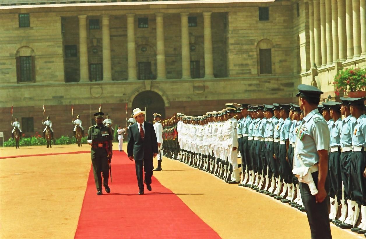 | Caption: | The President of India, Shri K R Narayanan at the Ceremonial Reception of the President of the Kyrgyz Republic, HE Mr Askar Akayev and his wife Maryam Akayeva at the Forecourt of Rashtrapati Bhavan in New Delhi on April 13, 1999 |