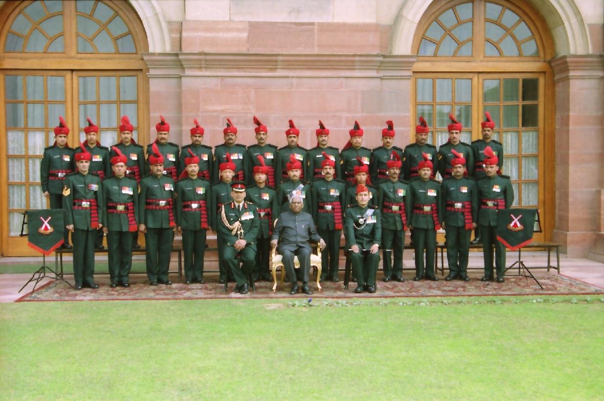 | Caption: | The President of India, Shri K R Narayanan posing for a Group Photograph with Service Outriders and JAK LI Regt Centre Brass Band at the North Court of Rashtrapati Bhavan in New Delhi on Jan 30, 2001 |