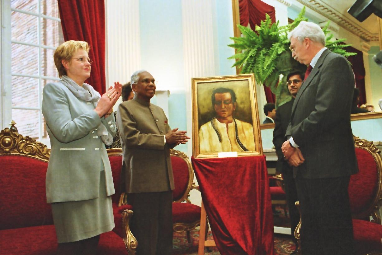 | Caption: | The President of India, Shri K R Narayanan being presented a Portrait of late Shri Satyajit Ray Painted by Smt Anjali Ela Menon to Mr Toscan du Plantier at Prefecture in Toulouse, France on April 19, 2000 |
