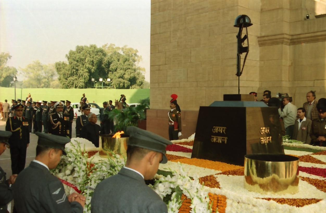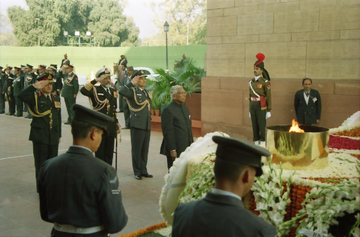 | Caption: | The President of India, Shri K R Narayanan paying homage to Amar Jawan Jyoti on Vijay Diwas at India Gate in New Delhi on Dec 16, 1999 |