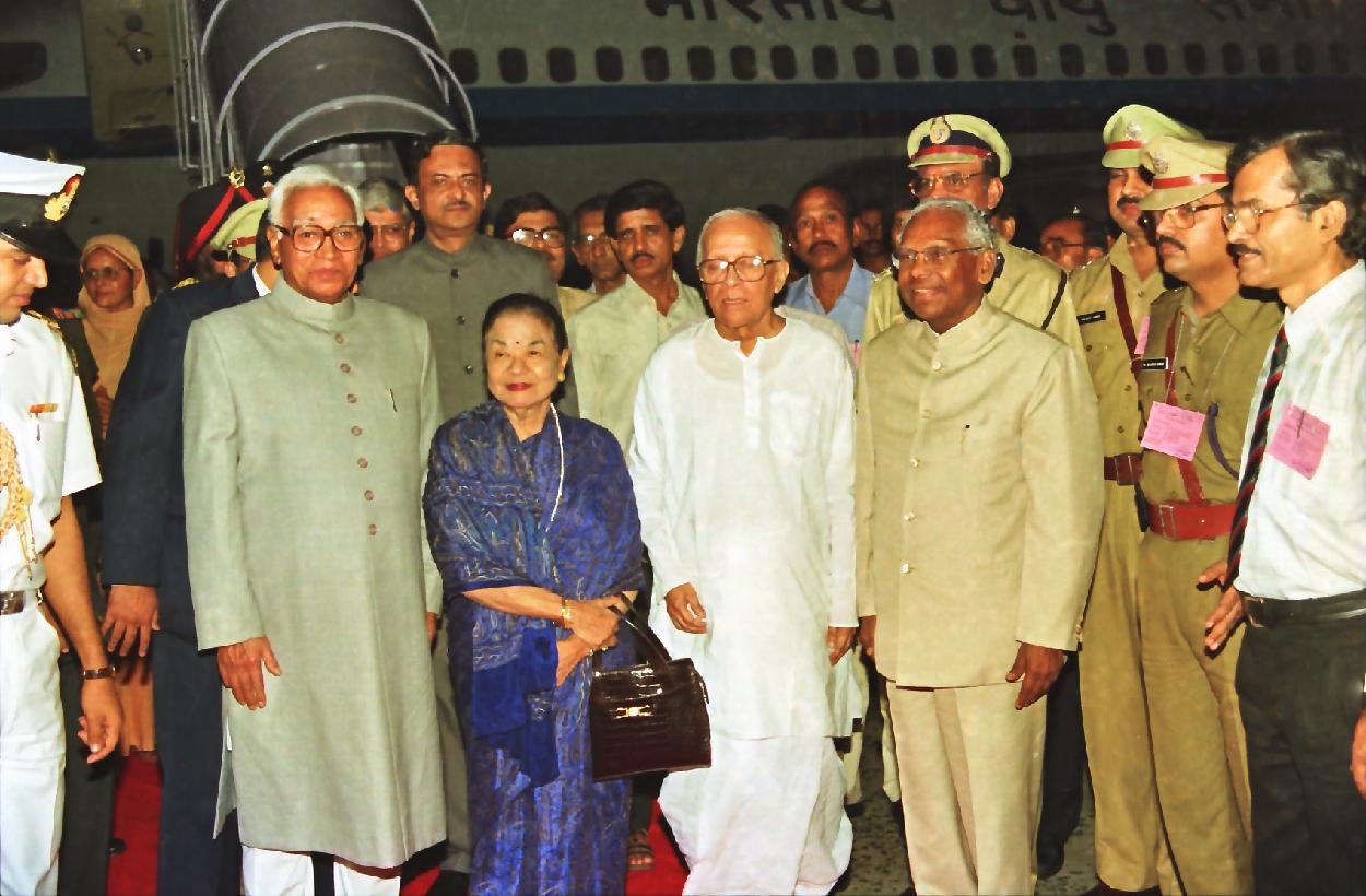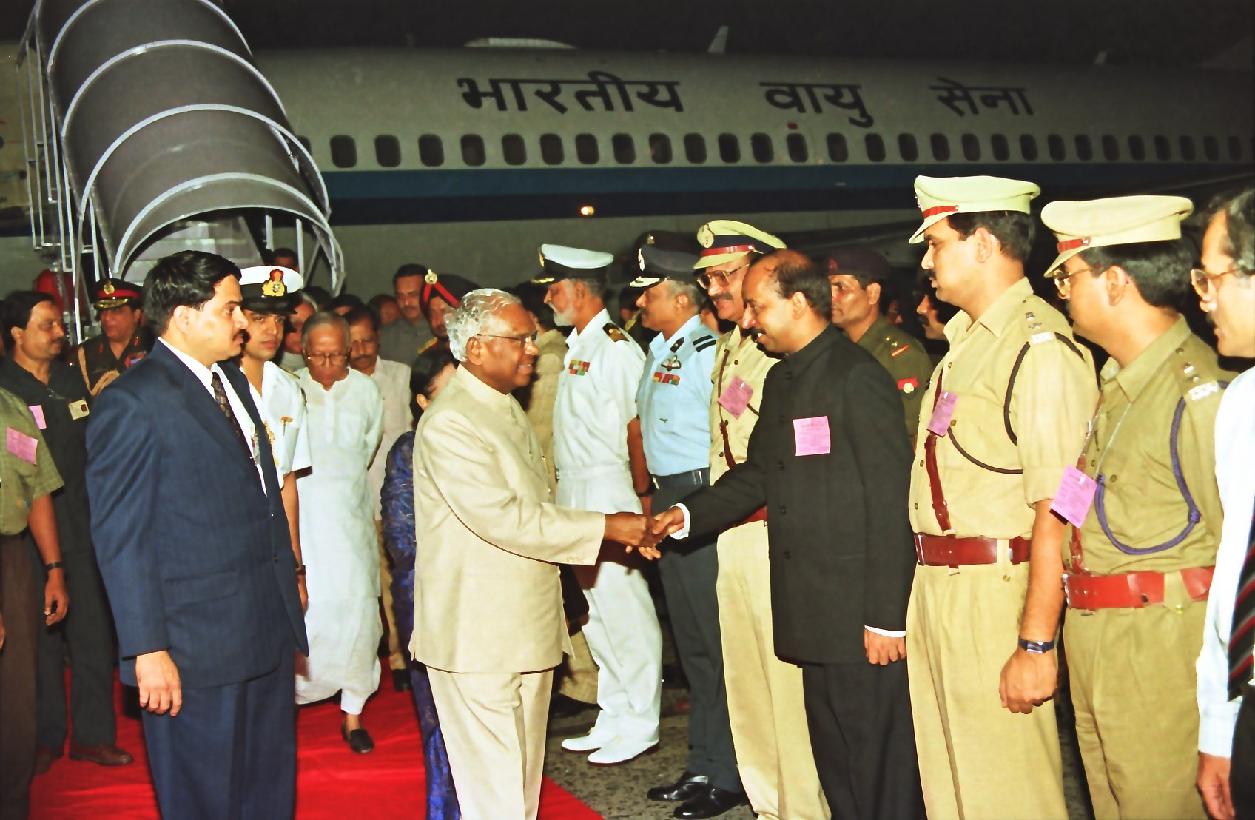 | Caption: | The President of India, Shri K R Narayanan being welcomed by the Governor of West Bengal, Shri Akhlaqur Rahman Kidwai and the Chief Minister of West Bengal, Shri Jyoti Basu at Kolkata Airport in West Bengal on Nov 05, 1998 |