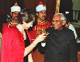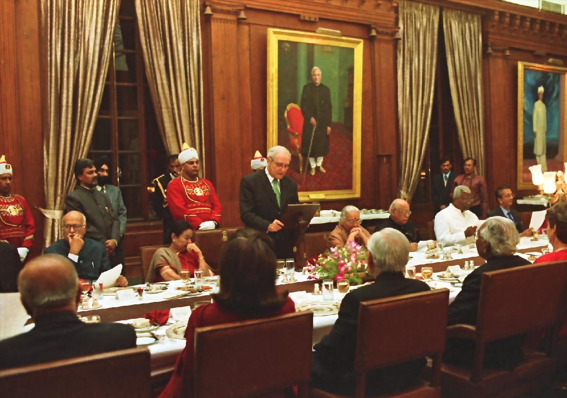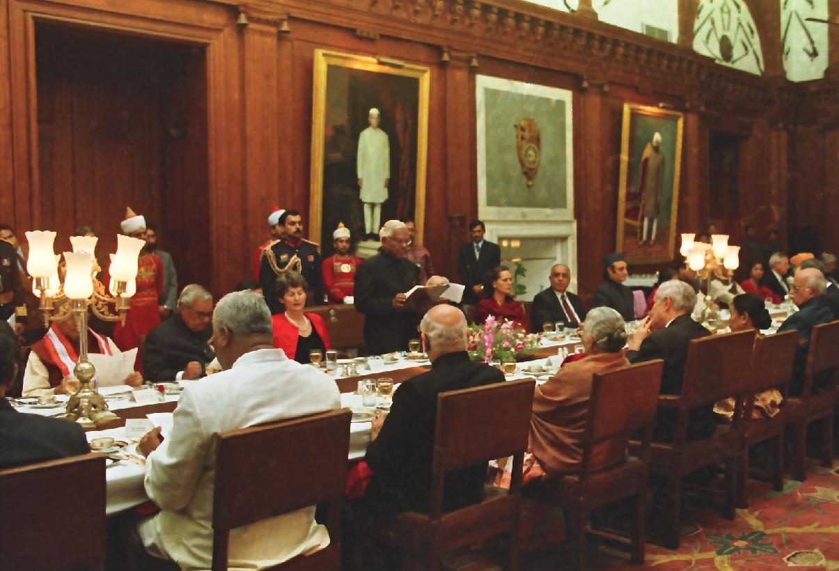 | Caption: | The President of India, Shri K R Narayanan at the Banquet in honour of the Distinguished Guests of the President of the Swiss Confederation, HE Mr Flavio Cotti and his wife Mrs Renata Cotti at the Banquet Hall of Rashtrapati Bhavan in New Delhi on Nov 24, 1998 |