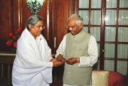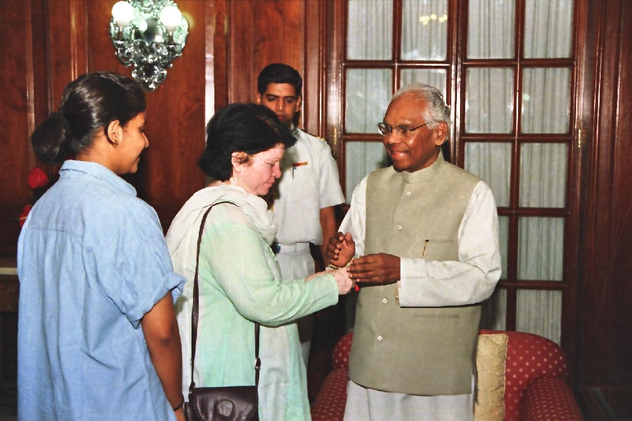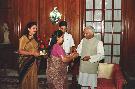 | Caption: | The President of India, Shri K R Narayanan receiving greetings on the occasion of Raksha Bandhan (tying of RAKHI) at the Committee Room of Rashtrapati Bhavan in New Delhi on Aug 26, 1999 |