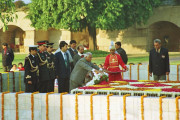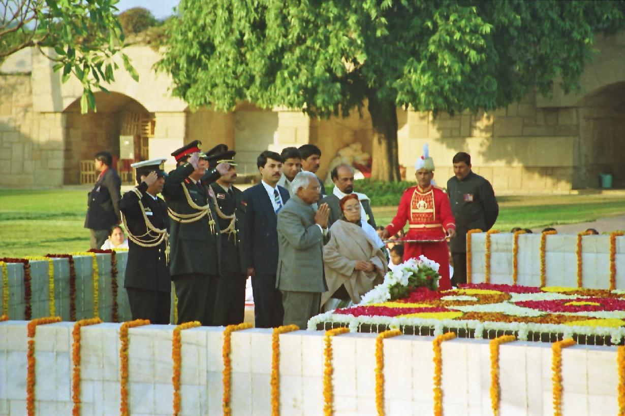| Caption: | The President of India, Shri K R Narayanan paying homage to the Father of the Nation, Shri Mahatma Gandhi at Rajghat in New Delhi on Jan 30, 2000 |