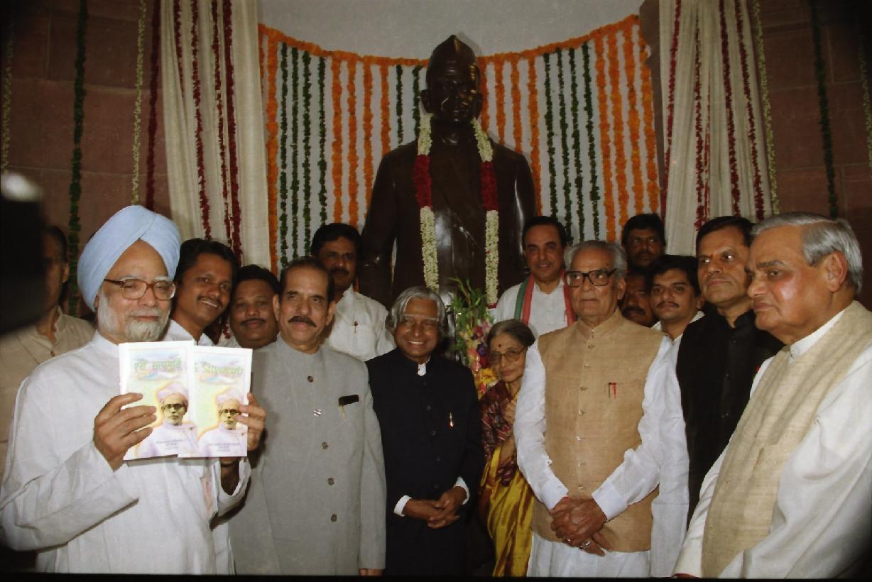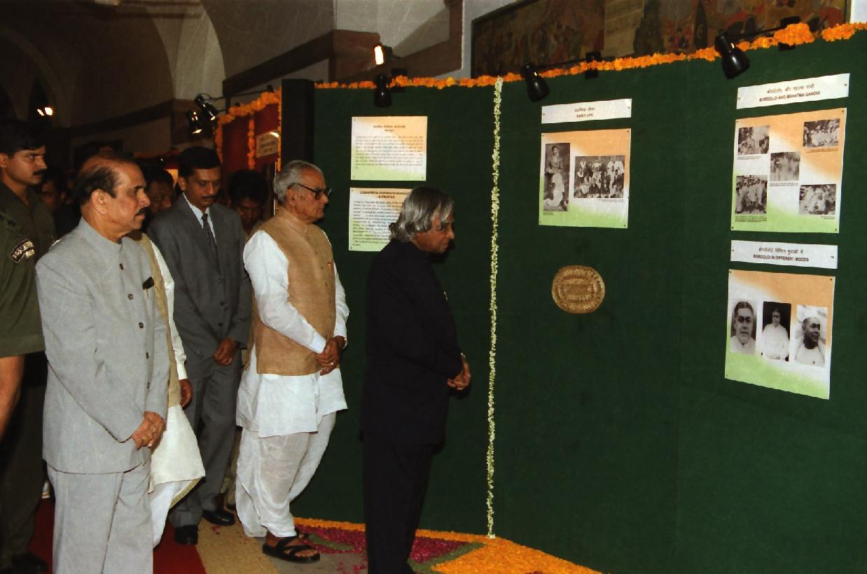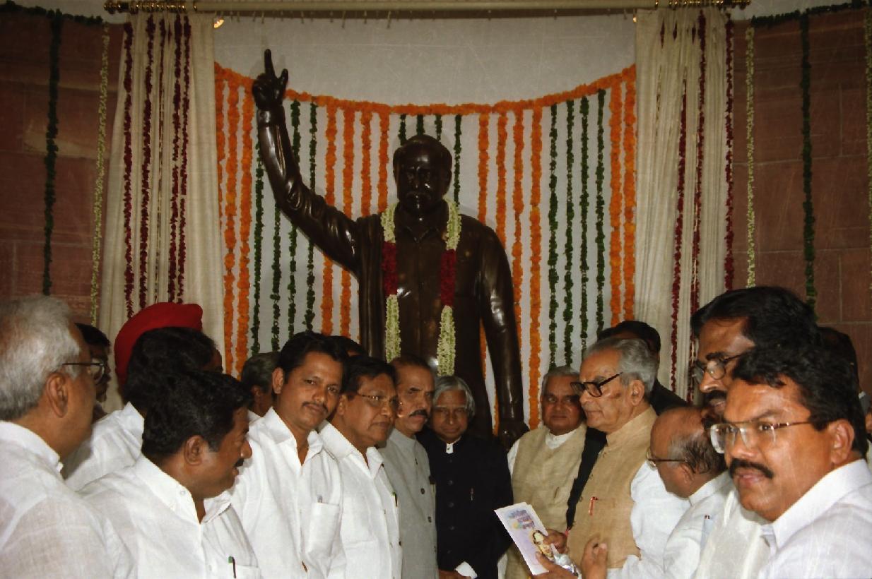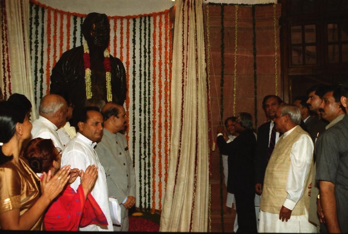 | Caption: | The President of India, Dr A P J Abdul Kalam unveiling the Statues of Bharat Ratna Lokapriya Gopinath Bordoloi, Late Shri C N Annadurai, Late Shri S Satyamurti and Late Shri Pasumpon Muthuramalinga Thevar at Parliament House in New Delhi on Oct 01, 2002 |