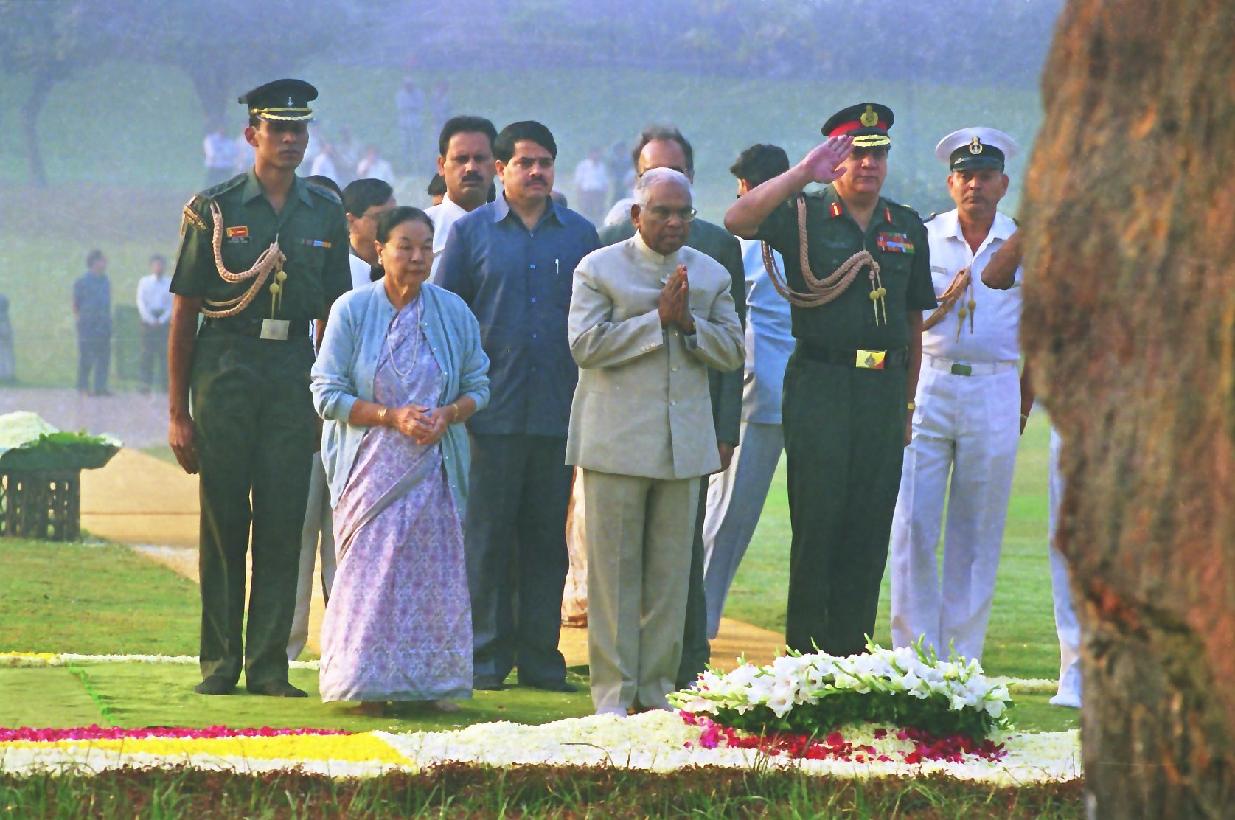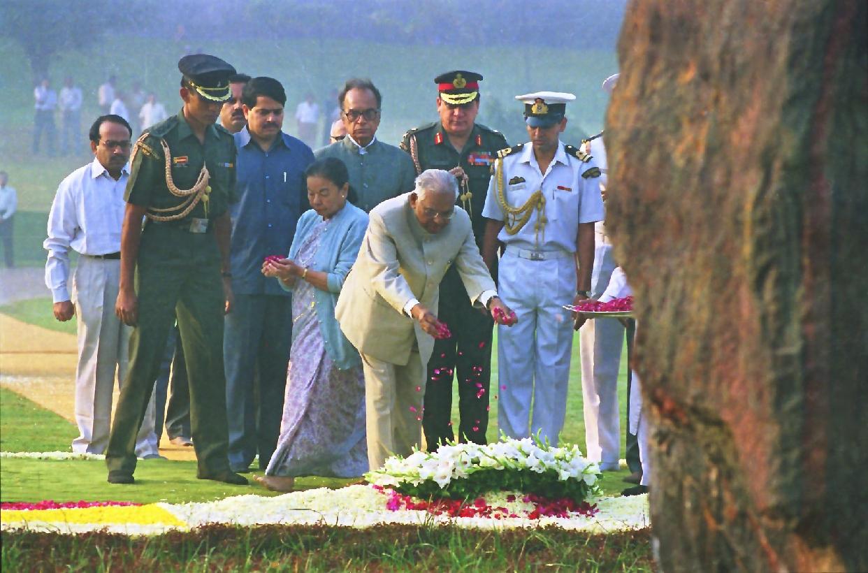| Caption: | The President of India, Shri K R Narayanan paying homage to the Former Prime Minister of India, Late Smt Indira Gandhi on the occasion of her Death Anniversary at Shakti Sthal in New Delhi on Oct 31, 1999 |
